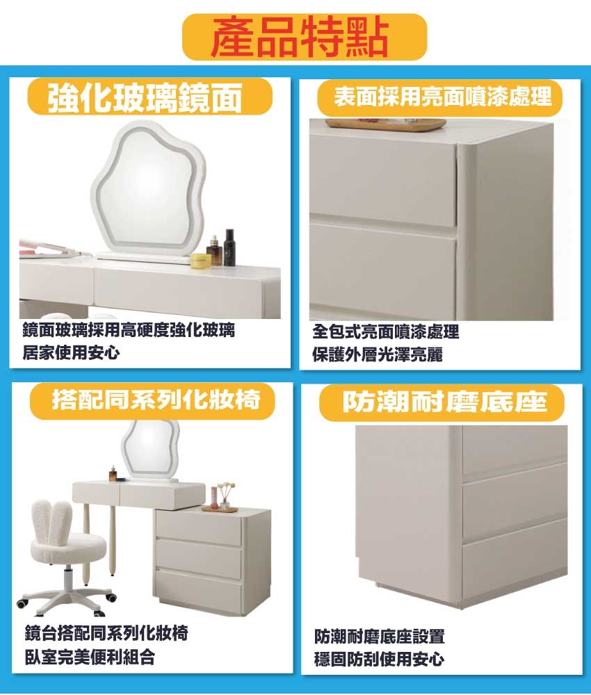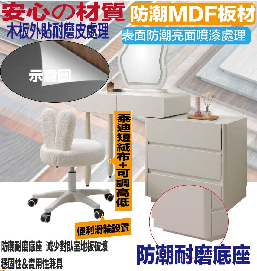 採用防潮MDF板+防潮耐磨底座+強化玻璃鏡面+泰迪短絨布料+高回彈泡棉等安心材質製造