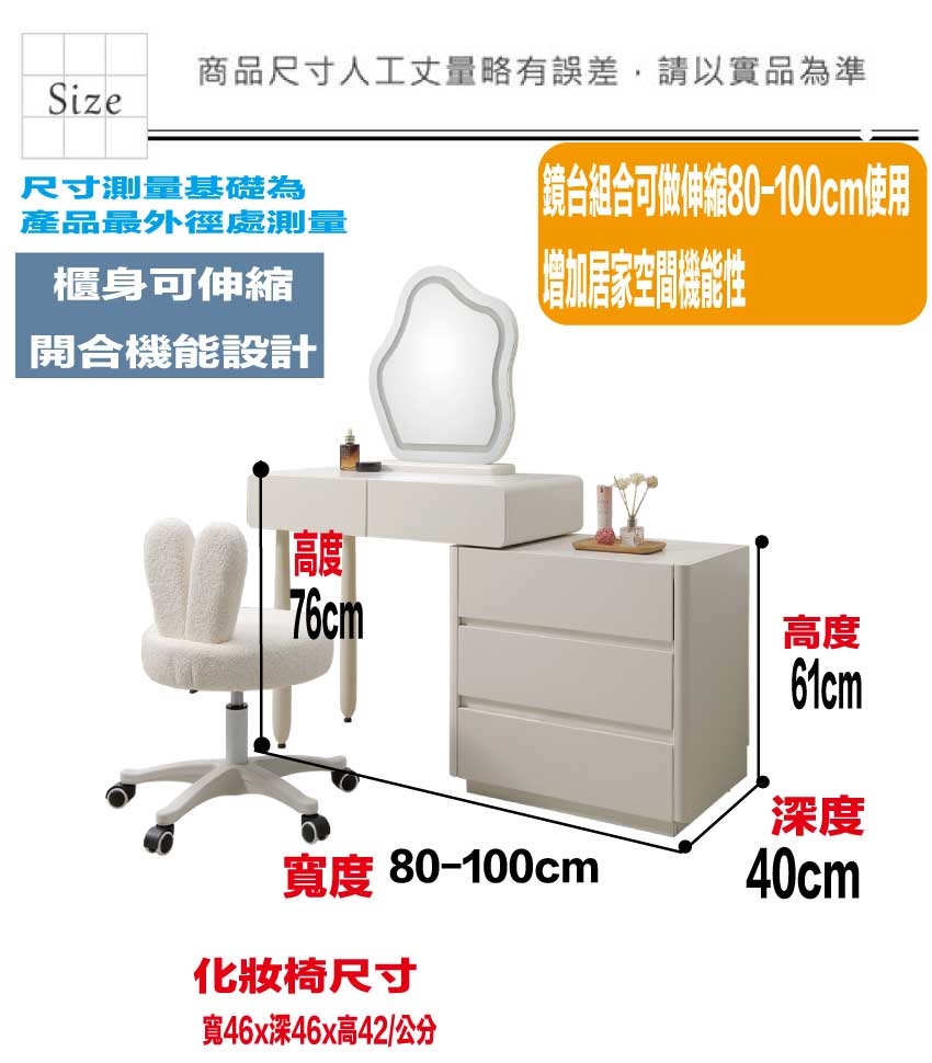 此鏡台組合可伸縮寬度80-120cm變化增加空間靈活性