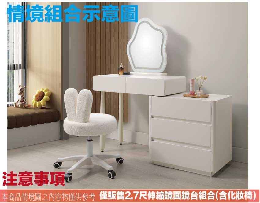 - ◆產品名稱:【綠家居】德恩2.7尺雙色伸縮觸控鏡面鏡台組合(含可升降化妝椅)