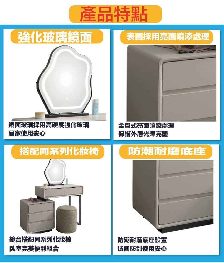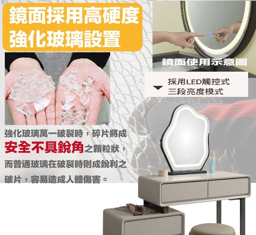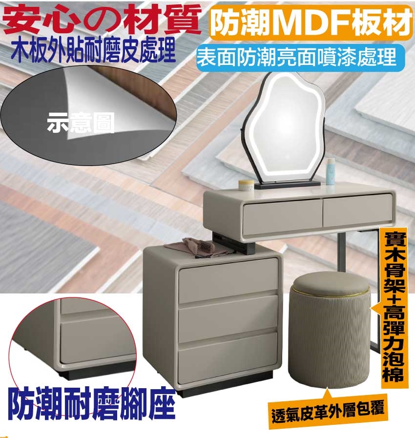 採用防潮MDF板+烤漆金屬腳座+強化玻璃鏡面+透氣柔韌皮革+高回彈泡棉等安心材質製造