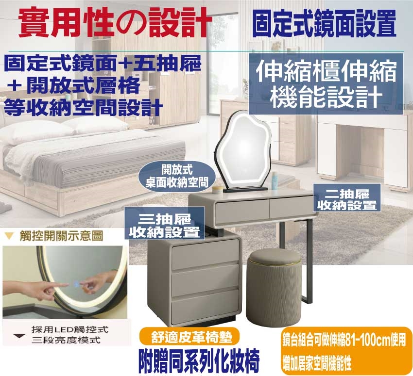 搭配採用固定觸控鏡面+五抽屜+內&外開放層格等收納空間設計