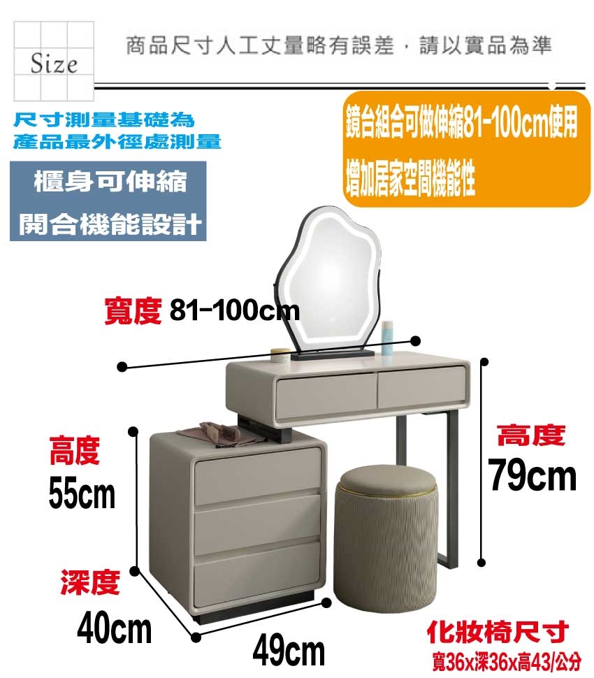此鏡台組合可伸縮寬度81-100cm變化增加空間靈活性