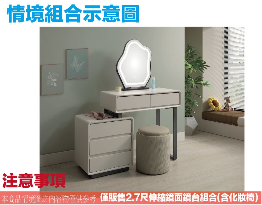 - ◆產品名稱:【綠家居】羅德2.7尺伸縮觸控鏡面鏡台組合(含化妝椅)