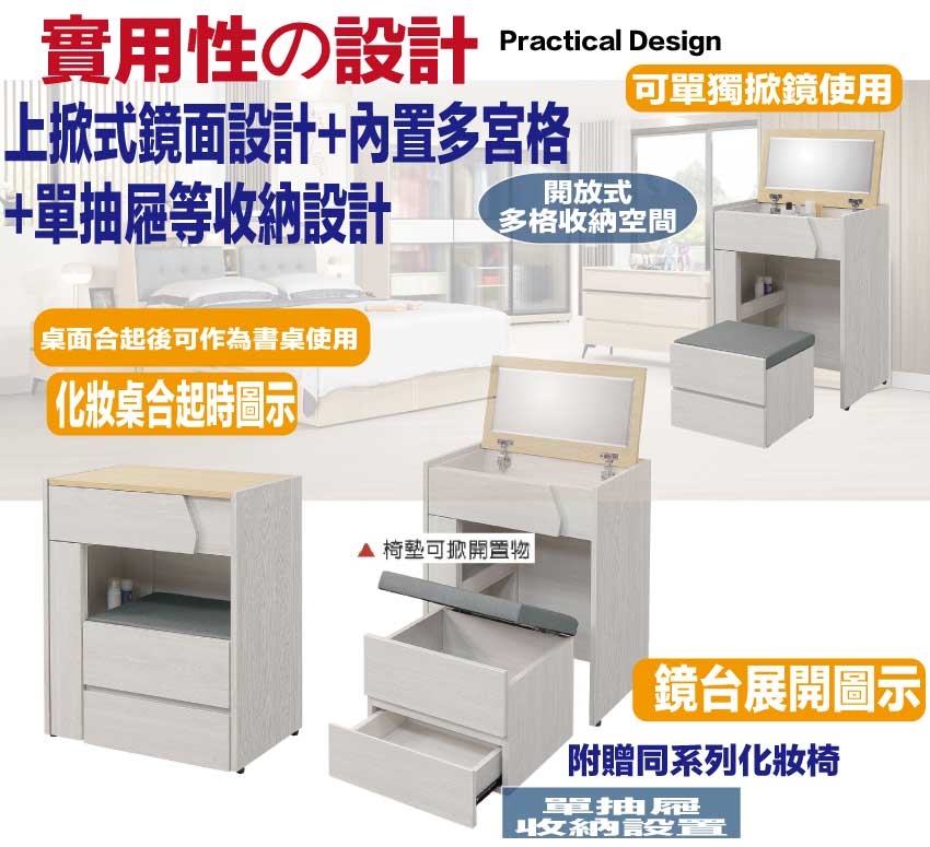 鏡台採用櫃身可拉合變化鏡台&書桌/收納櫃使用搭配可掀置物&可收納於櫃身中的化妝椅高CP值便利性設計