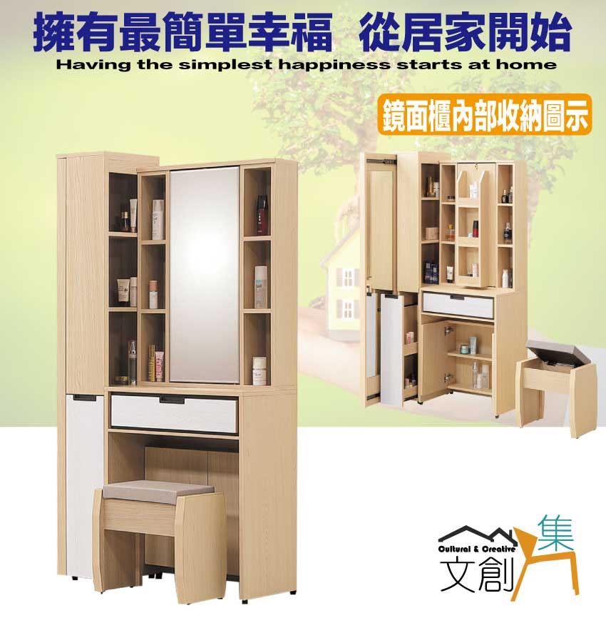 ★偏遠地區需額外加收運費,下標請先問與答詢問★ ★下訂前注意 由於商品流動較快,下訂前請先詢問是否有貨在下訂喔~★ 【綠家居】亞卡利雙色2.8尺旋轉鏡面鏡台/化妝台組合(鏡台+側拉鏡面櫃+含化妝椅) 木紋雙色系+安心材質製造,使用放心+搭配居家更便利,採用防蛀木心板+五金滑軌結構+強化玻璃鏡面+防潮耐磨底座等安心材質製造 ,外層採用防潮耐磨噴漆處理搭配採用旋轉鏡面櫃+拉合櫃+單抽屜+內&外開放層格+側拉玻璃鏡面設置等收納空間設計,全由專人配送到家,專業安心服務,替你省下更多時間!