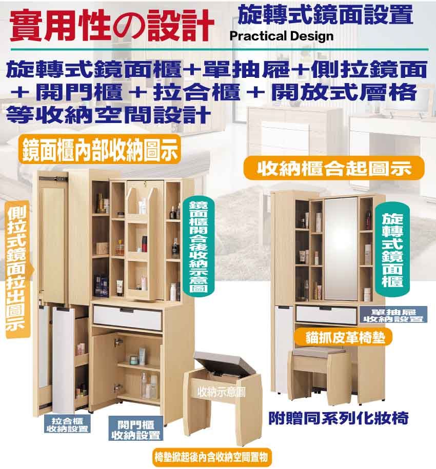 - ◆產品名稱:【綠家居】亞卡利雙色2.8尺旋轉鏡面鏡台/化妝台組合(鏡台+側拉鏡面櫃+含化妝椅)