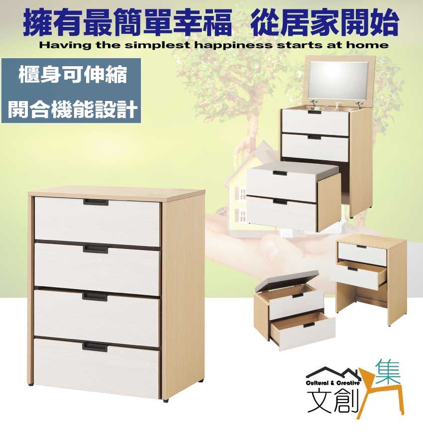 此鏡台搭配上掀鏡面即可收合化妝椅凳,收合後可作為收納櫃擺設,增加居家空間變化性