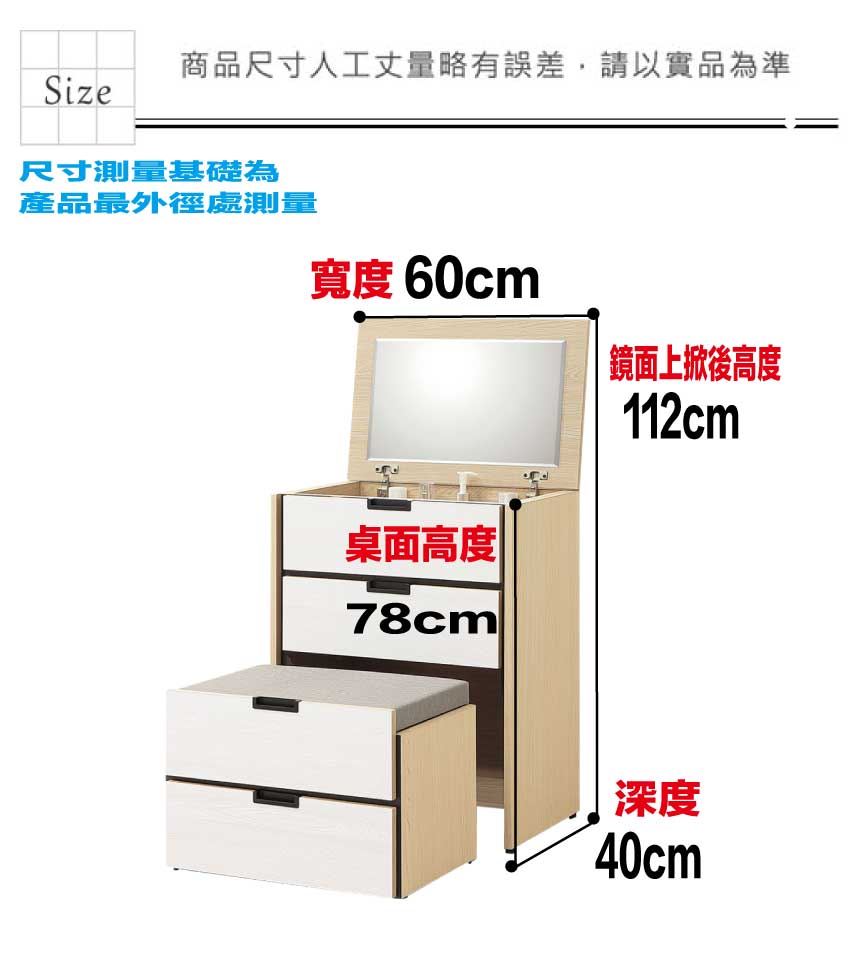 - ◆產品名稱:【綠家居】亞卡利雙色2尺多功能變化鏡台/化妝台組合(上掀鏡面+含化妝椅)