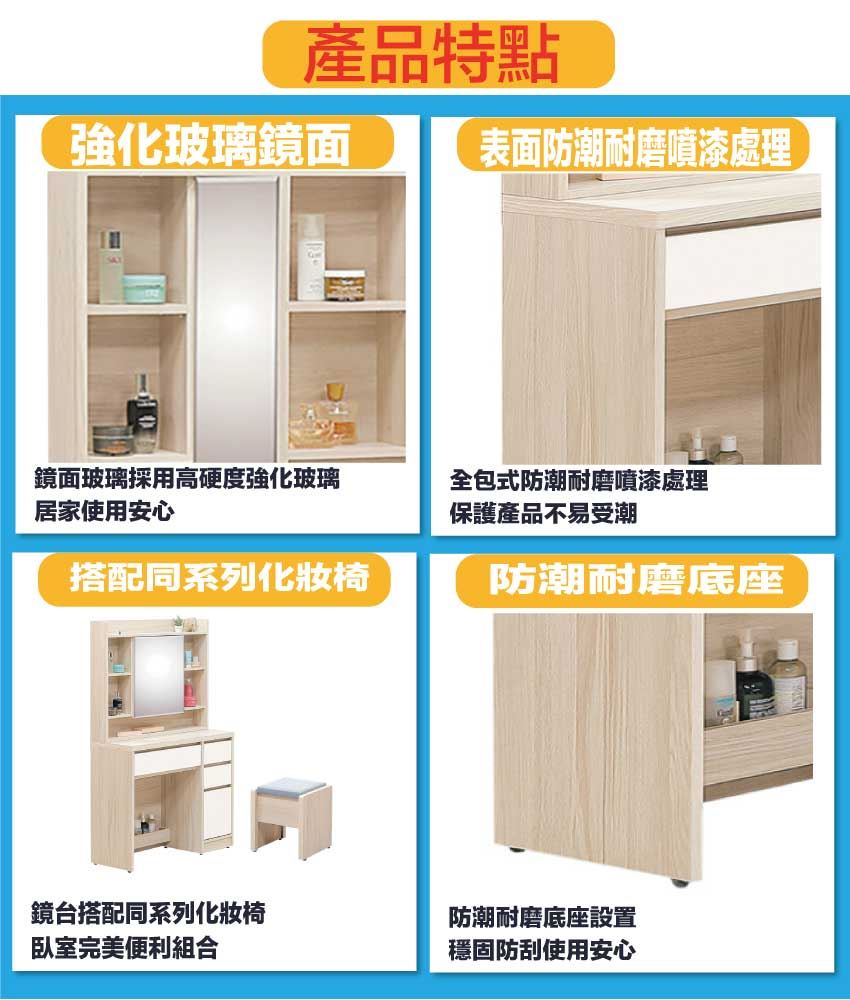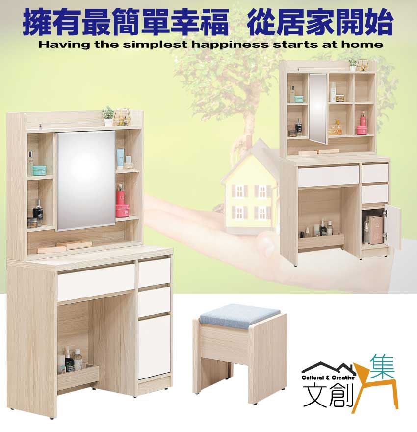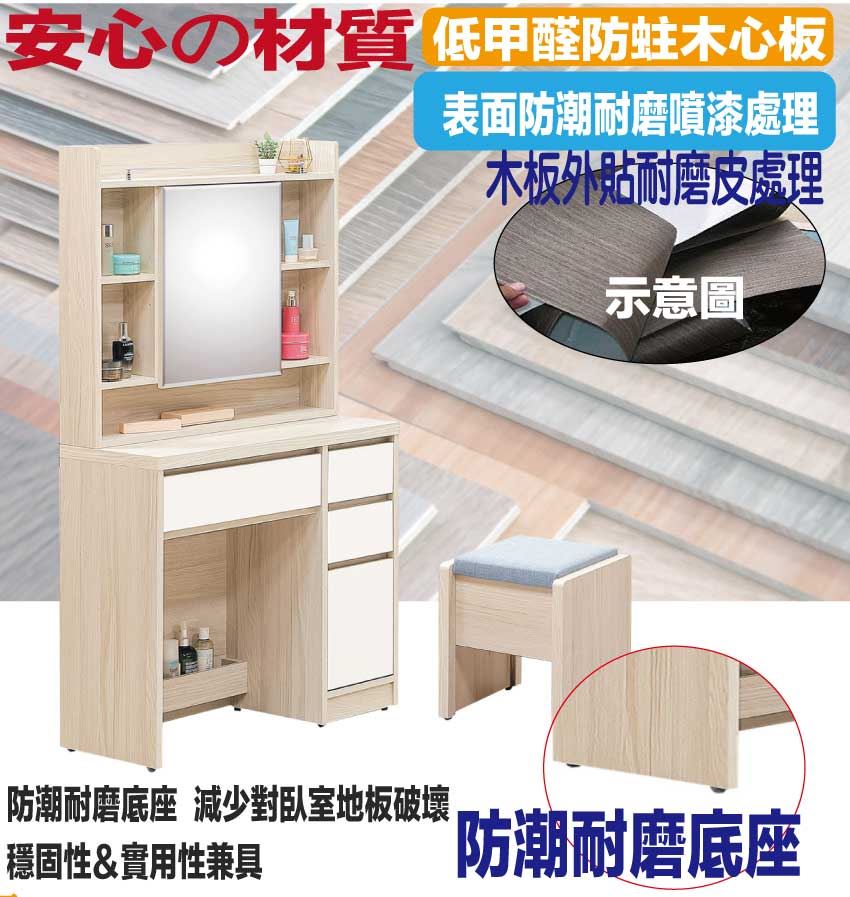 ★偏遠地區需額外加收運費,下標請先問與答詢問★ ★下訂前注意 由於商品流動較快,下訂前請先詢問是否有貨在下訂喔~★ 【綠家居】山多利雙色2.7尺開合鏡面鏡台/化妝台組合(含化妝椅) 木紋雙色系+安心材質製造,使用放心+搭配居家更便利,採用防蛀木心板+五金滑軌結構+強化玻璃鏡面+防潮耐磨底座等安心材質製造 ,外層採用防潮耐磨噴漆處理搭配採用開合鏡面櫃+開門櫃+三抽屜+內&外開放層格等收納空間設計,全由專人配送到家,專業安心服務,替你省下更多時間!