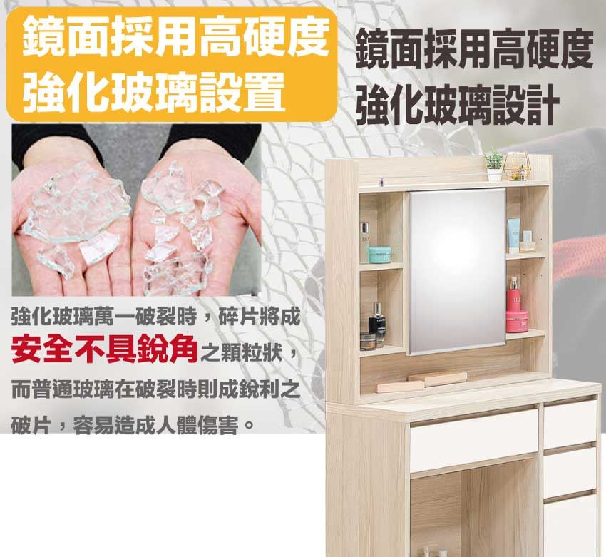 採用防蛀木心板+五金滑軌結構+強化玻璃鏡面+防潮耐磨底座等安心材質製造