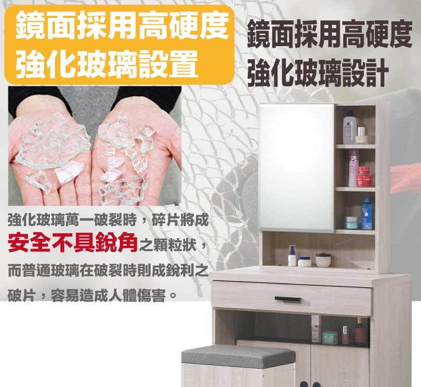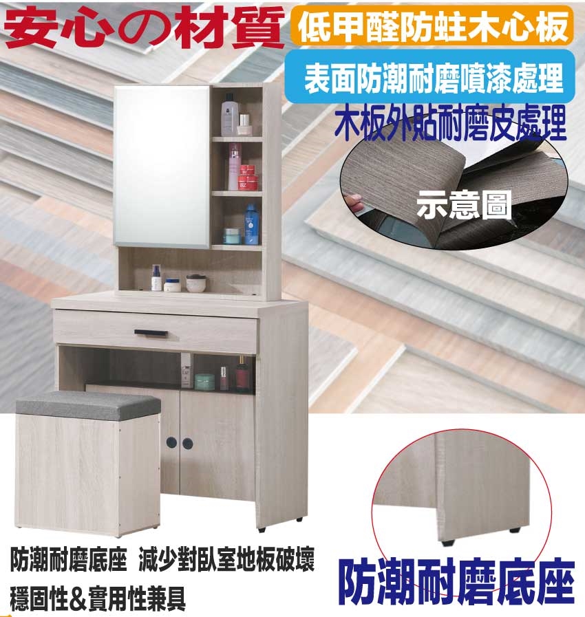 採用防蛀木心板+五金滑軌結構+強化玻璃鏡面+防潮耐磨底座等安心材質製造