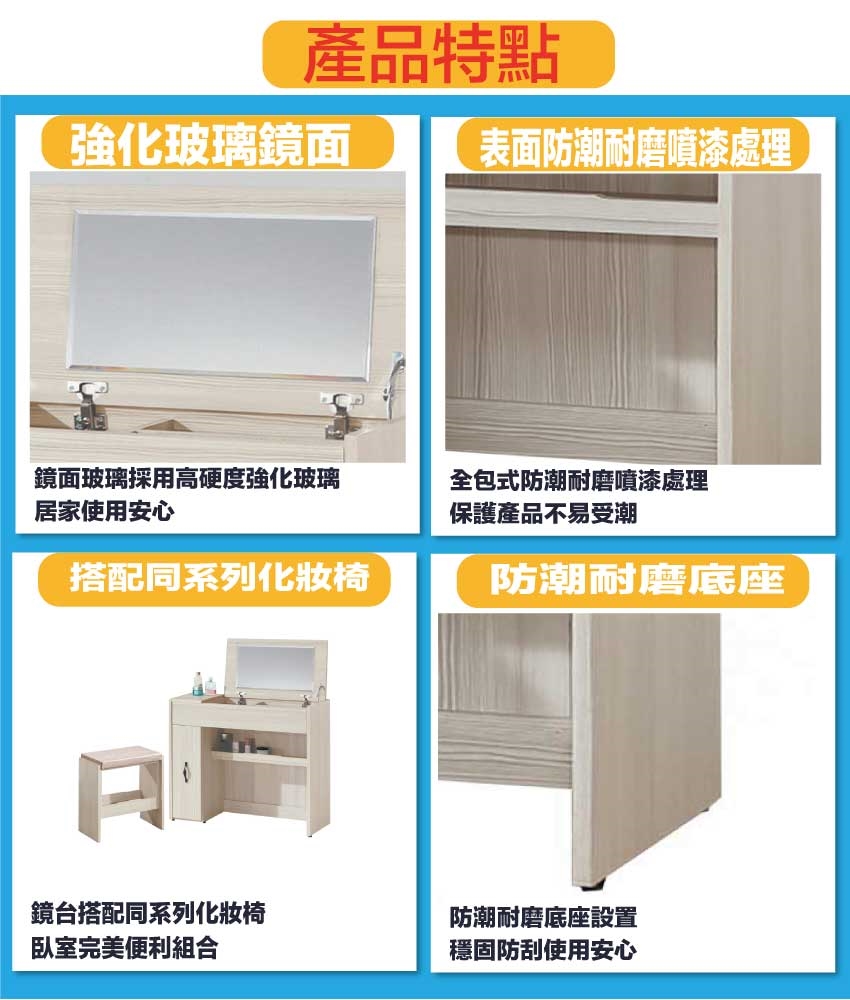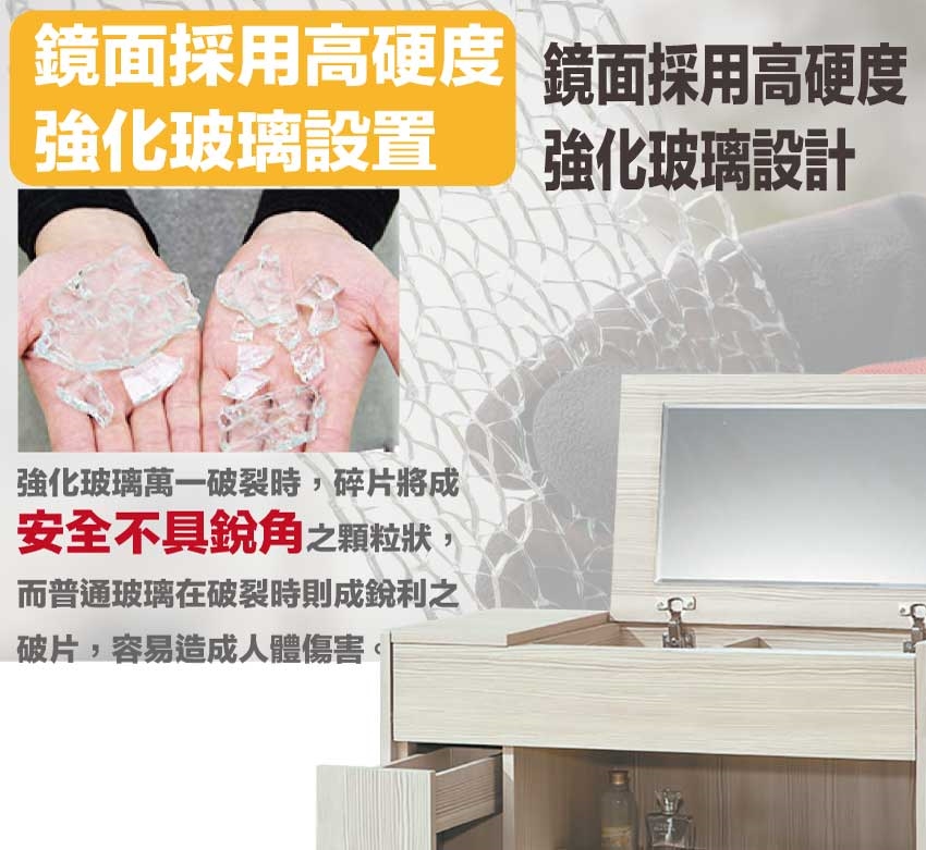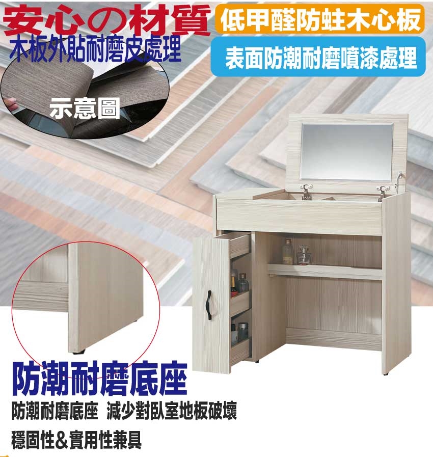 採用防蛀木心板+五金滑軌結構+強化玻璃鏡面+防潮耐磨底座等安心材質製造