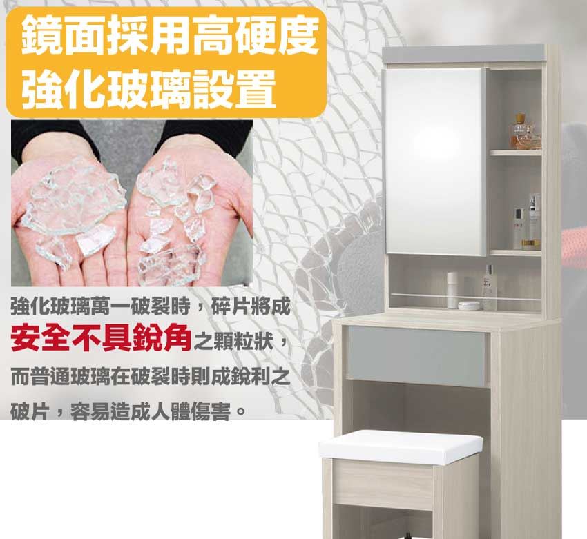 採用防蛀木心板+防潮耐磨底座+五金滑軌結構+強化玻璃鏡面等安心材質製造