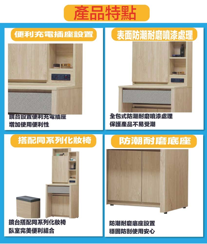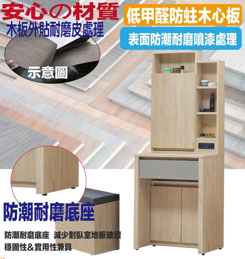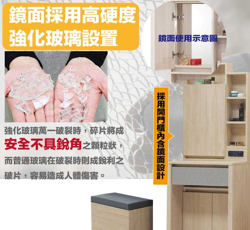 採用防蛀木心板+防潮耐磨底座+強化玻璃鏡面等安心材質製造