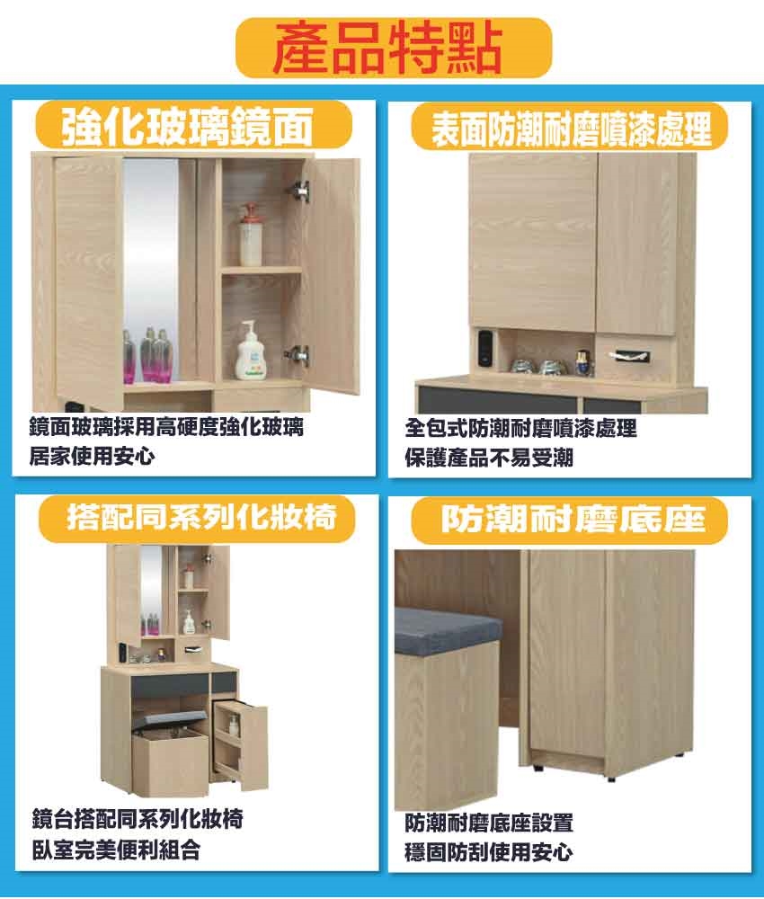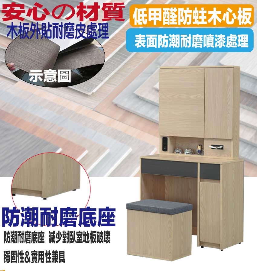 採用防蛀木心板+防潮耐磨底座+強化玻璃鏡面等安心材質製造