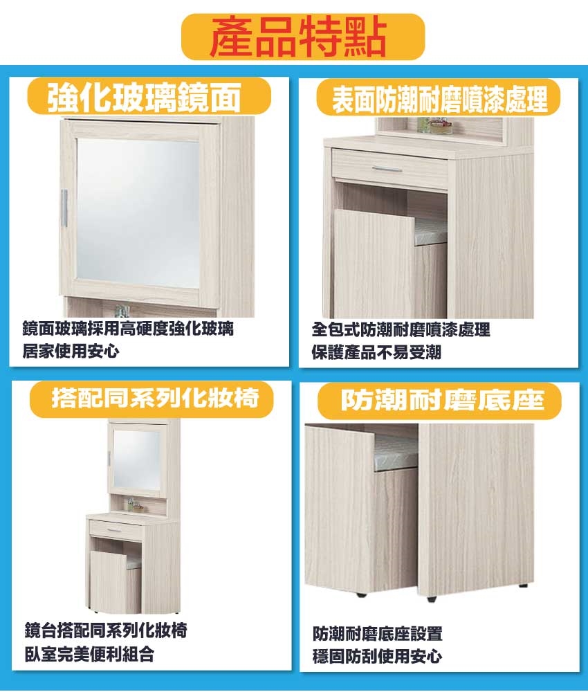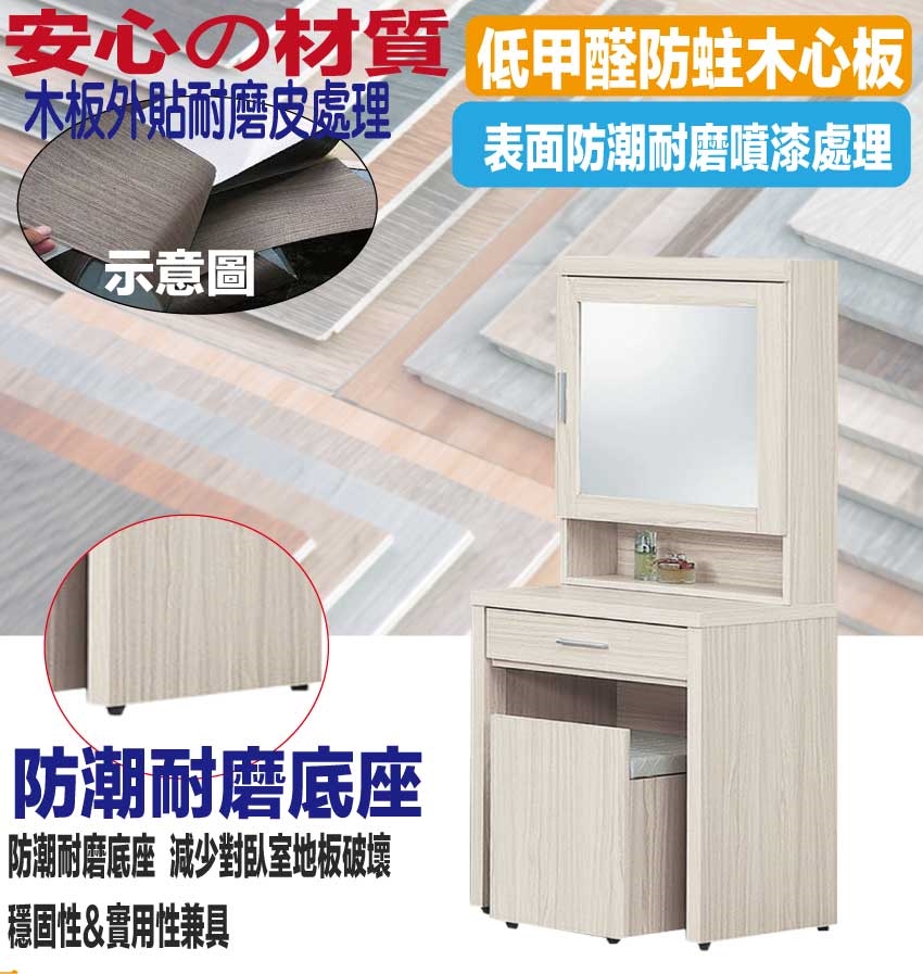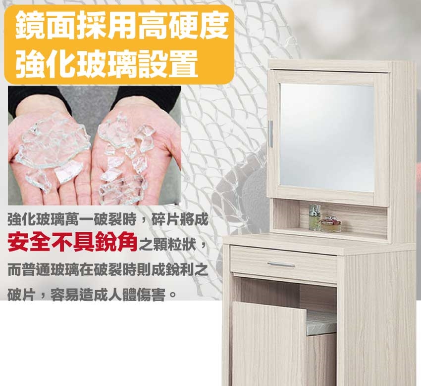 採用防蛀木心板+防潮耐磨底座+強化玻璃鏡面等安心材質製造