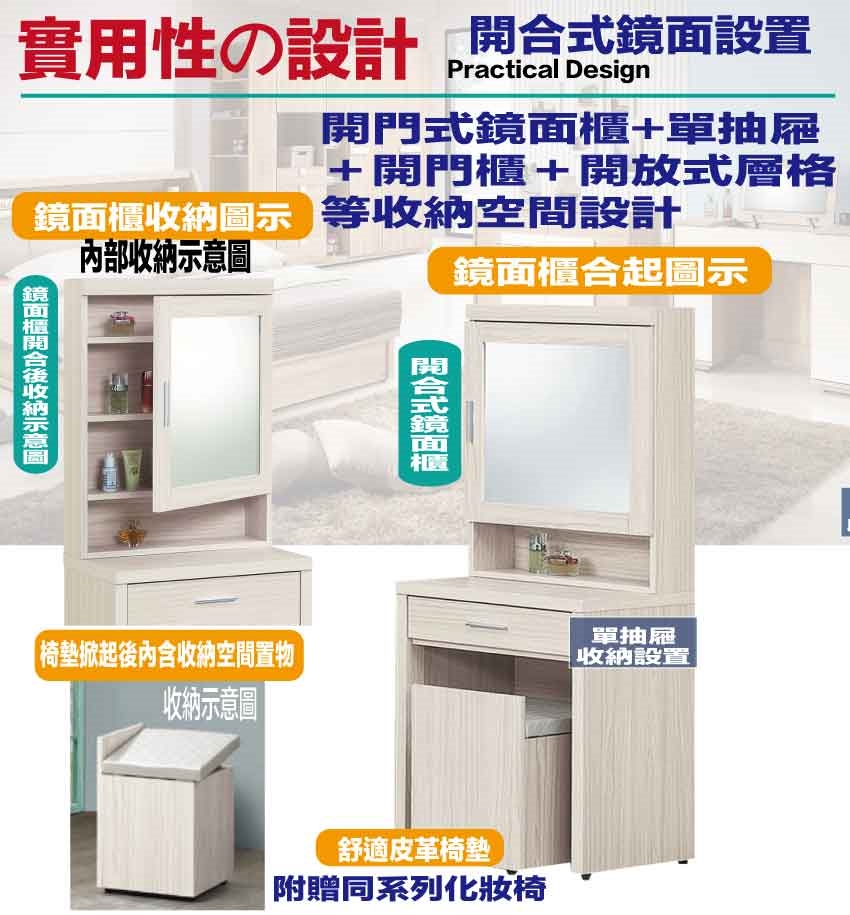 - ◆產品名稱:【綠家居】包格斯2尺開合鏡面鏡台組合(含化妝椅)