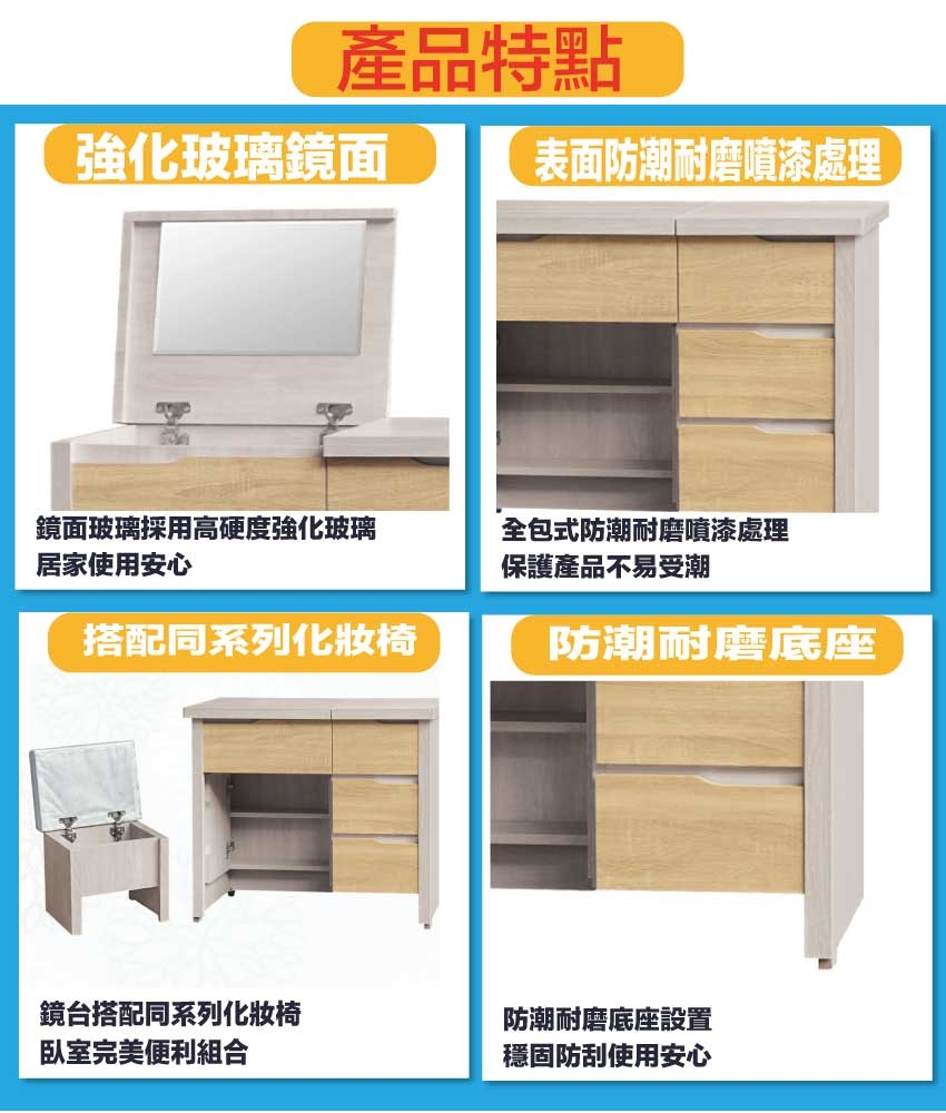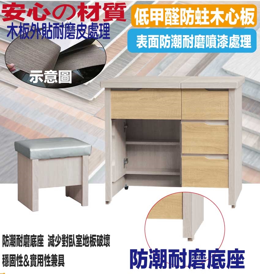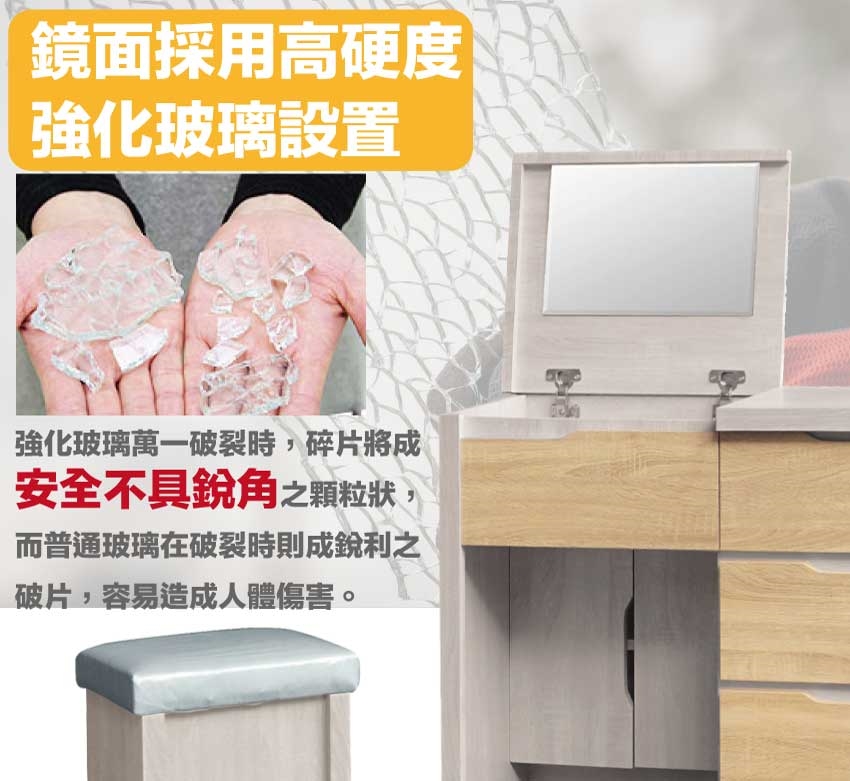 採用防蛀木心板+防潮耐磨底座+強化玻璃鏡面等安心材質製造