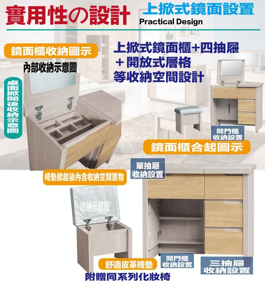 搭配採用上掀鏡面櫃+三抽屜+內&外開放層格等收納空間設計