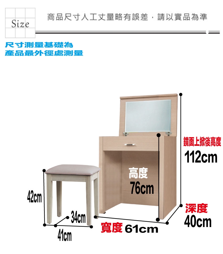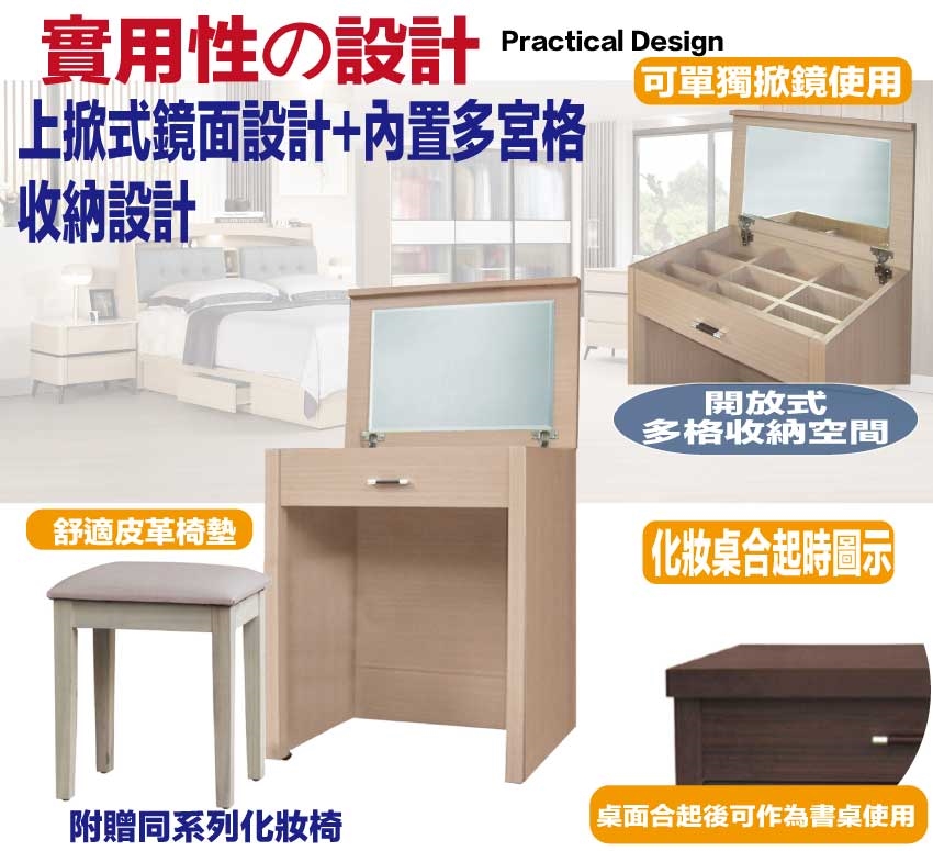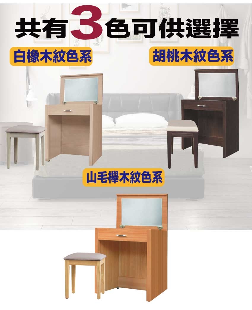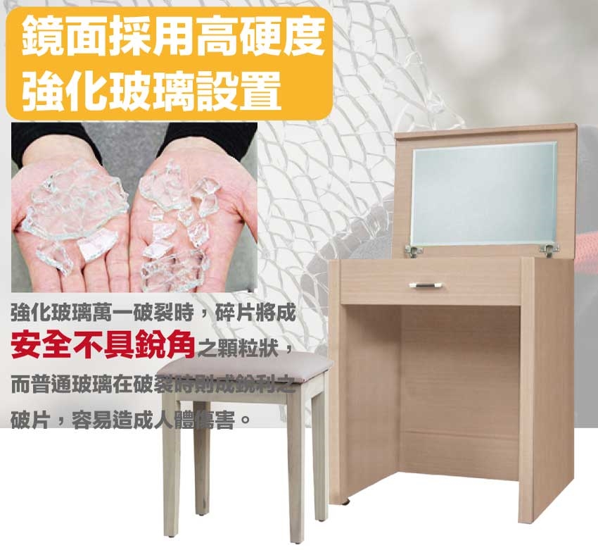 - ◆產品名稱:【綠家居】包格斯2尺上掀鏡面鏡台組合(三色可選+含化妝椅)