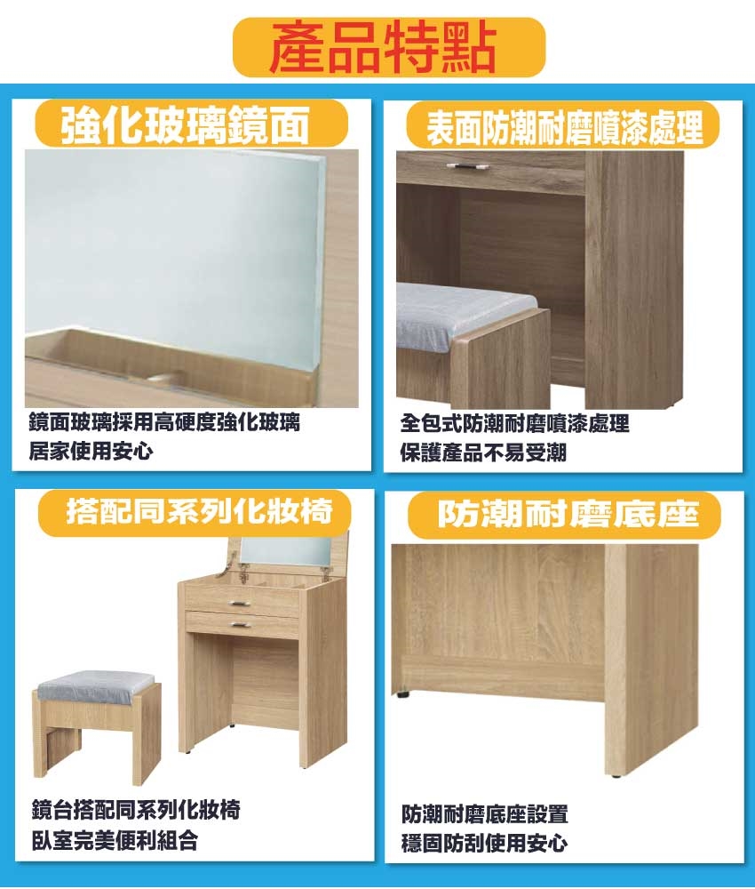 採用防蛀木心板+防潮耐磨底座+強化玻璃鏡面等安心材質製造