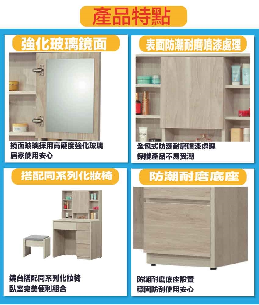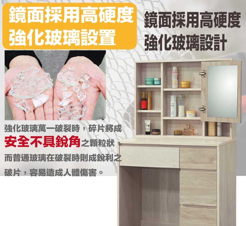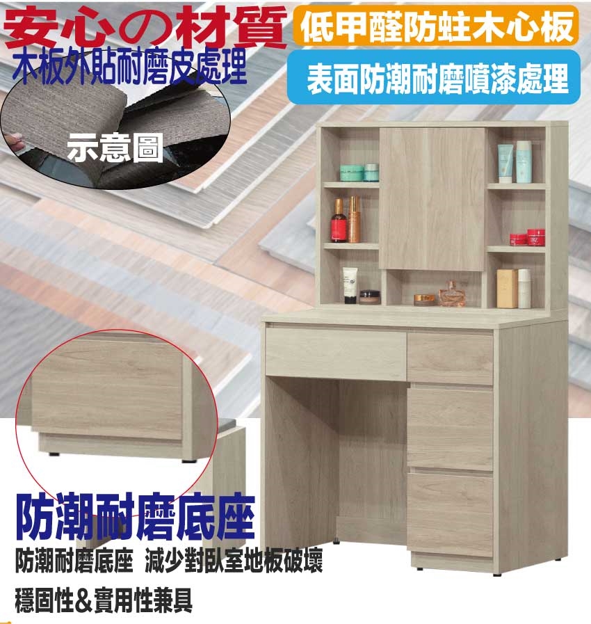 防蛀木心板+防潮耐磨底座(可調高低水平)+強化玻璃鏡面等安心材質製造