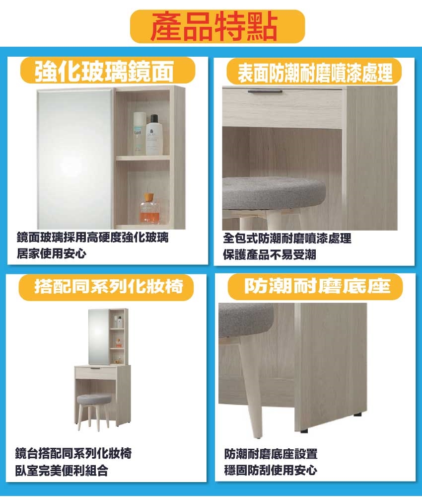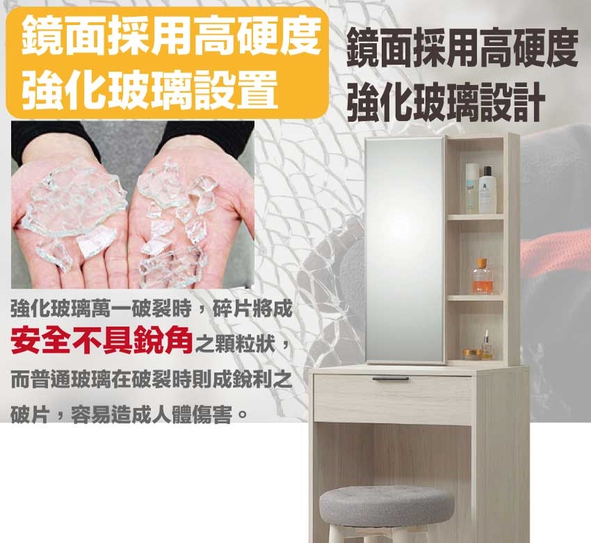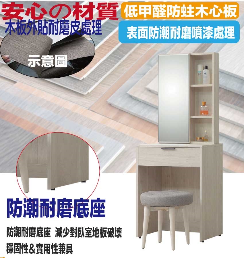 防蛀木心板+防潮耐磨底座+強化玻璃鏡面等安心材質製造
