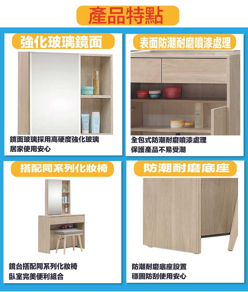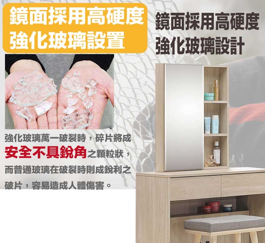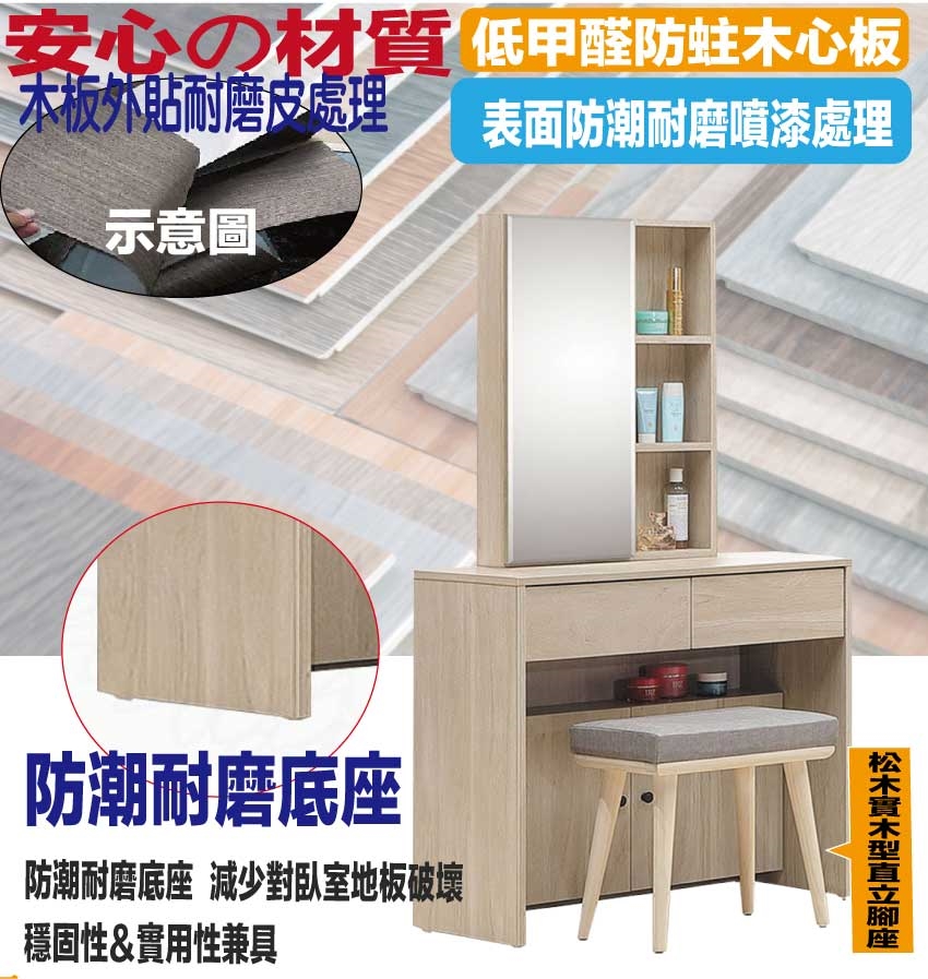 防蛀木心板+防潮耐磨底座+強化玻璃鏡面等安心材質製造