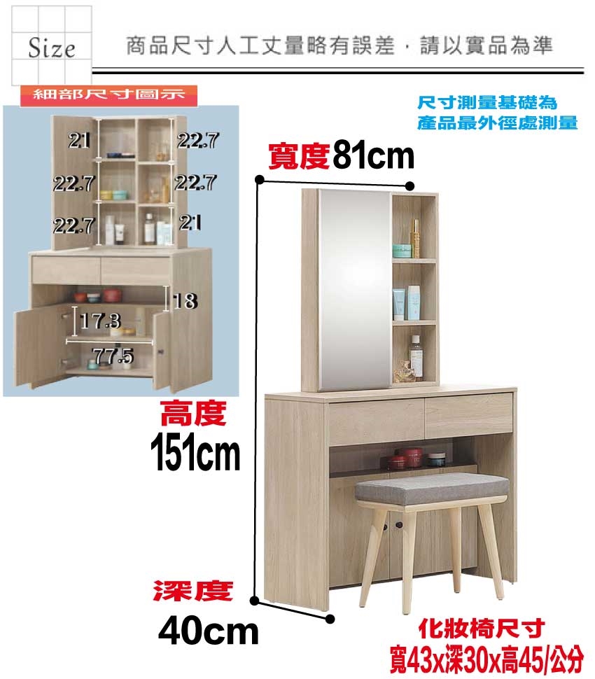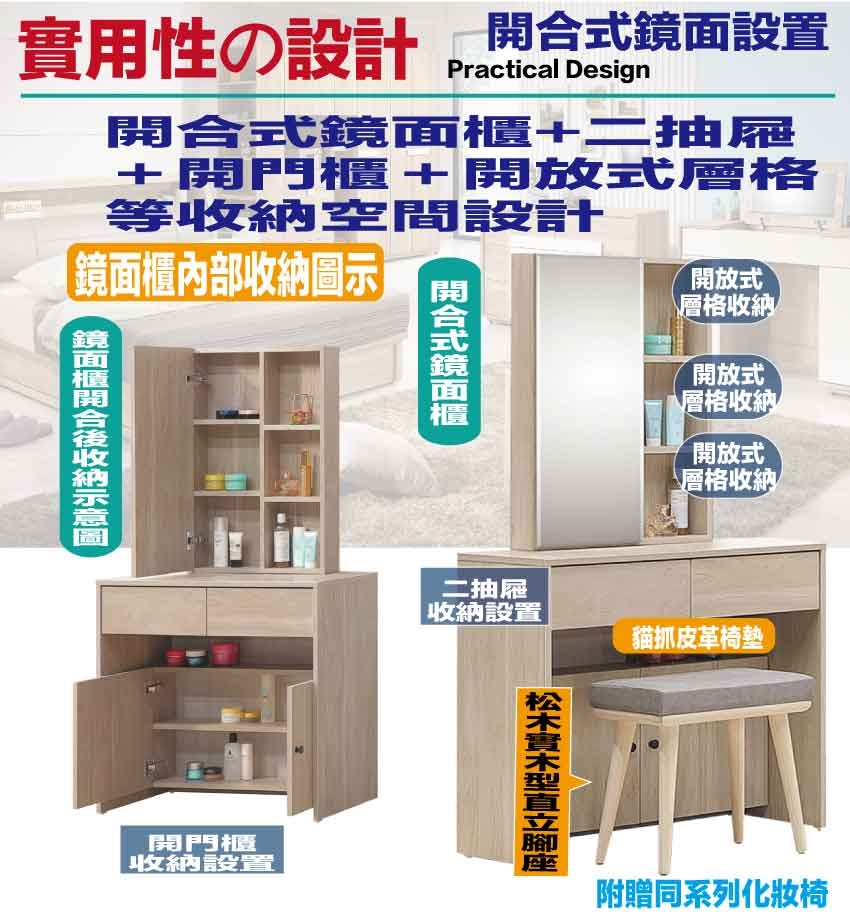 - ◆產品名稱:【綠家居】卡羅2.7尺開合式鏡面鏡台組合(含化妝椅)