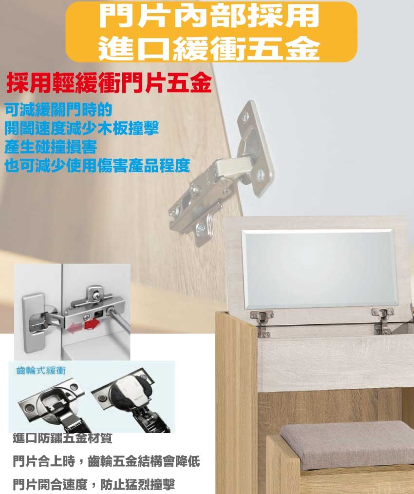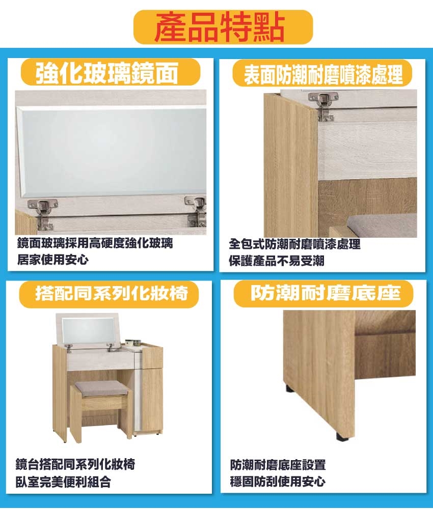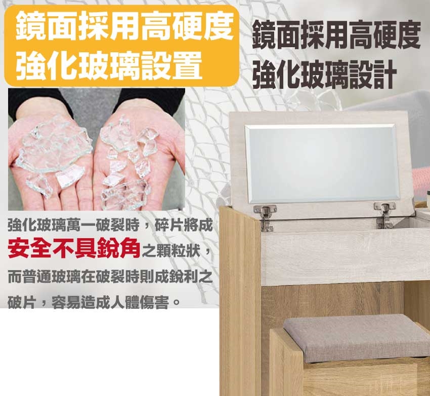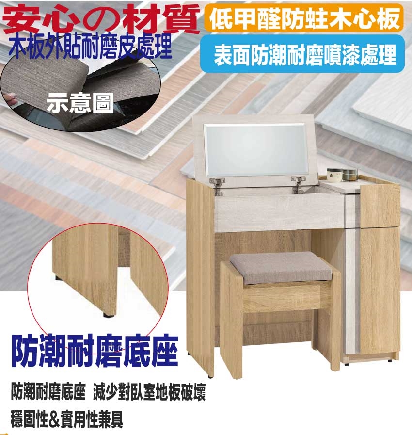 防蛀木心板+防潮耐磨底座(可調高低水平)+強化玻璃鏡面等安心材質製造