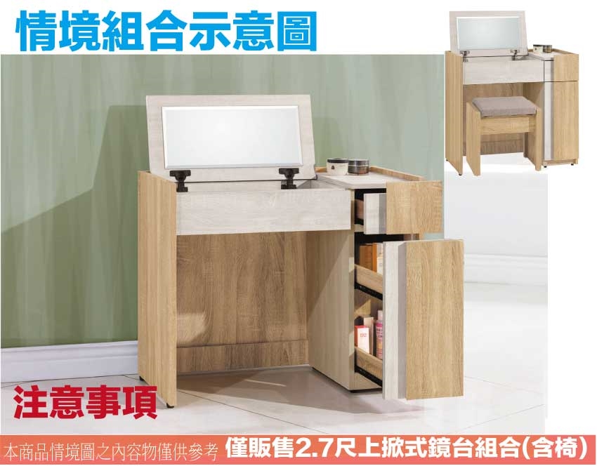 ★偏遠地區需額外加收運費,下標請先問與答詢問★ ★下訂前注意 由於商品流動較快,下訂前請先詢問是否有貨在下訂喔~★ 【綠家居】艾羅2.7尺上掀式鏡面鏡台組合(含可收納化妝椅) 木紋雙色系+現代簡約風格+安心材質製造,使用放心+搭配居家更便利,整體採用防蛀木心板+防潮耐磨底座(可調高低水平)+強化玻璃鏡面等安心材質製造搭配外層採用優莉坦耐磨全包式噴漆處理 ,採用上掀式鏡面櫃+單抽屜+拉合櫃+內&外開放層格等收納空間設計,全由專人配送到家,專業安心服務,替你省下更多時間!