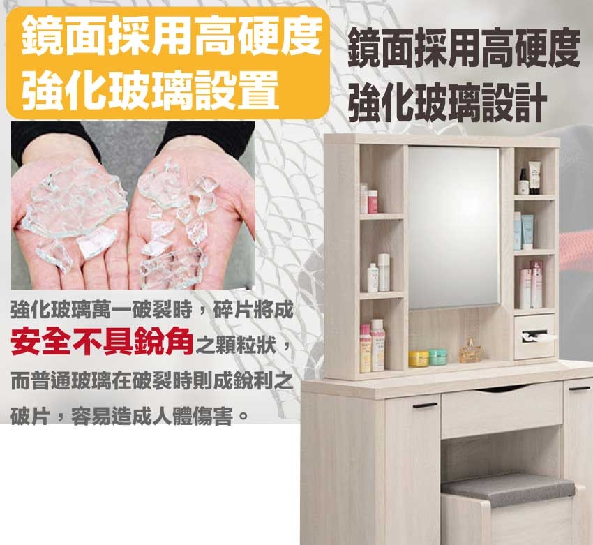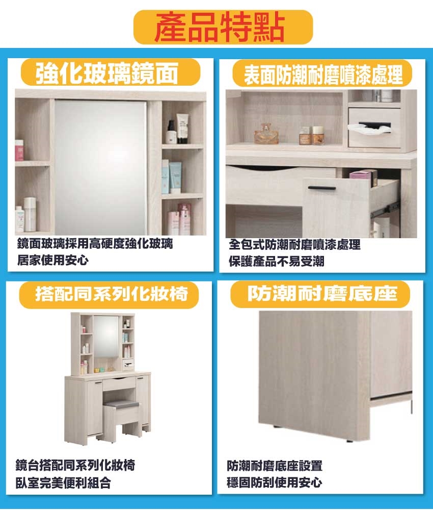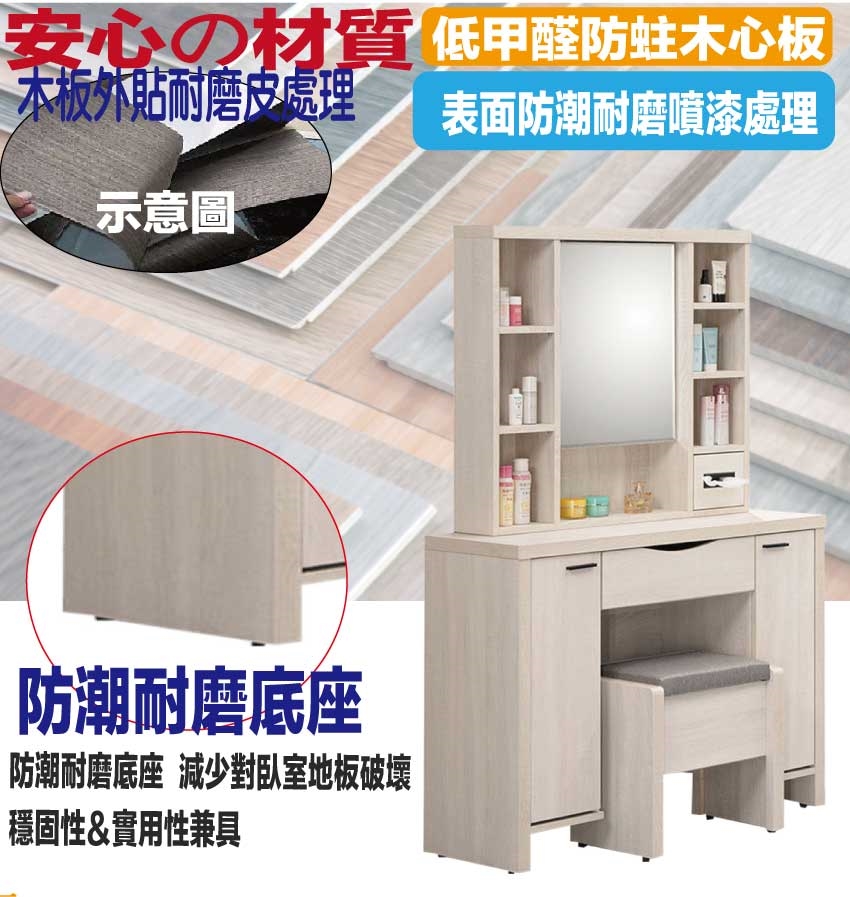 防蛀木心板+防潮耐磨底座(可調高低水平)+強化玻璃鏡面等安心材質製造
