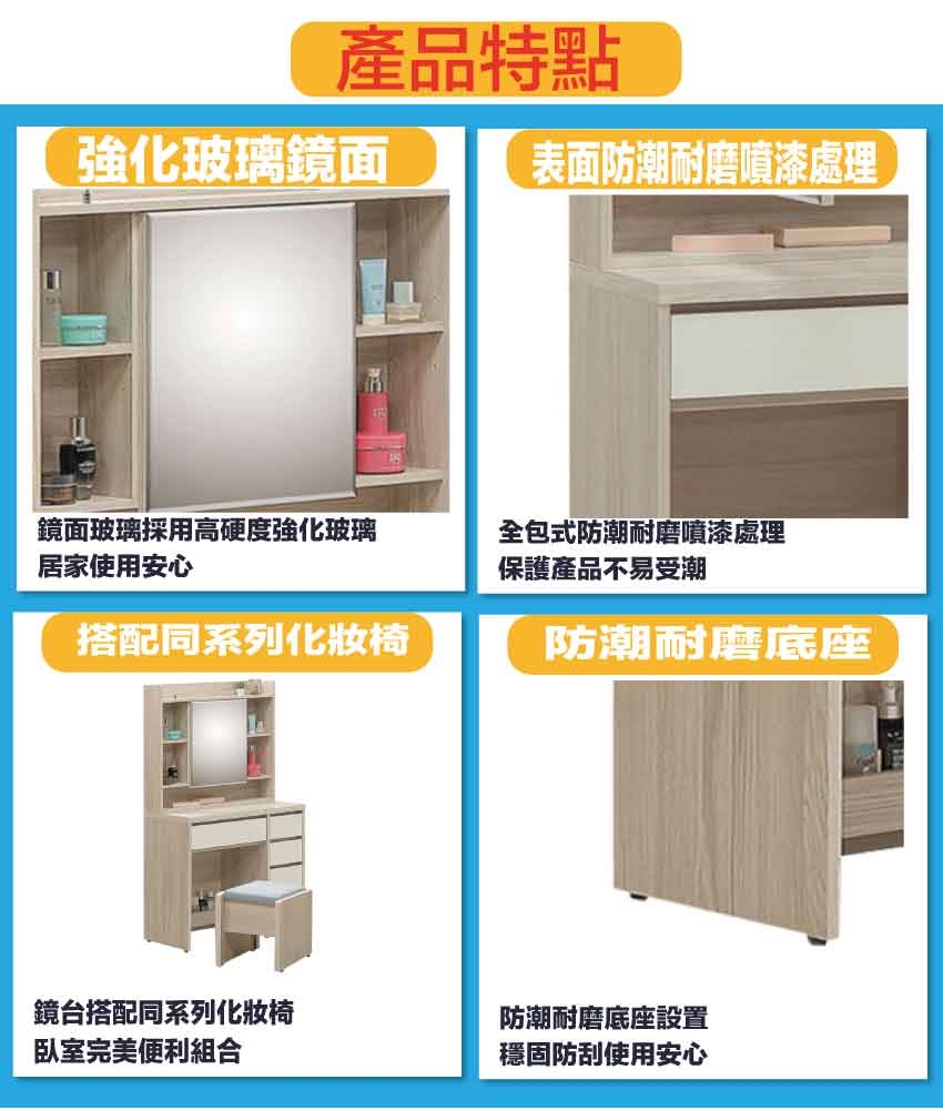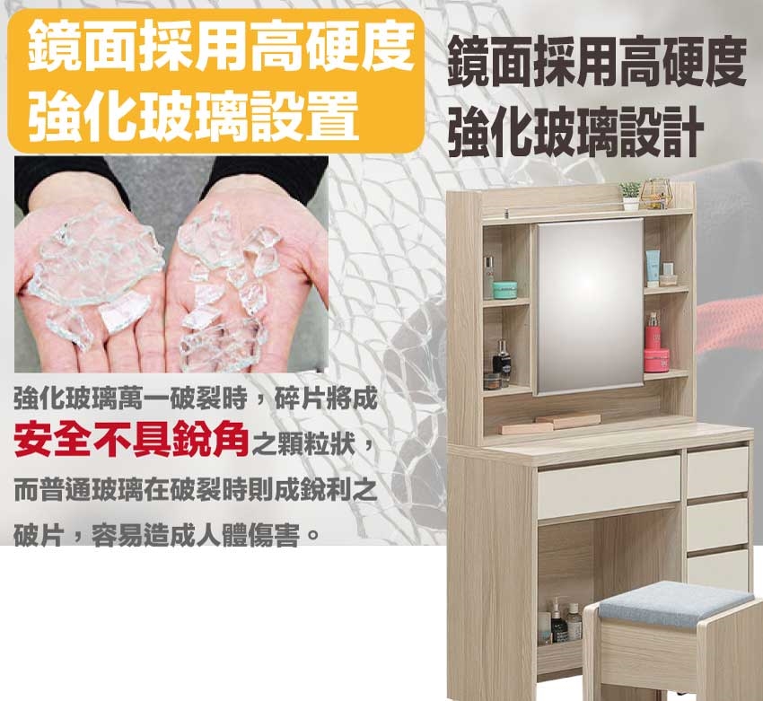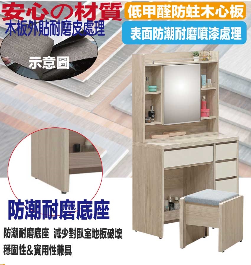 防蛀木心板+防潮耐磨底座(可調高低水平)+強化玻璃鏡面等安心材質製造
