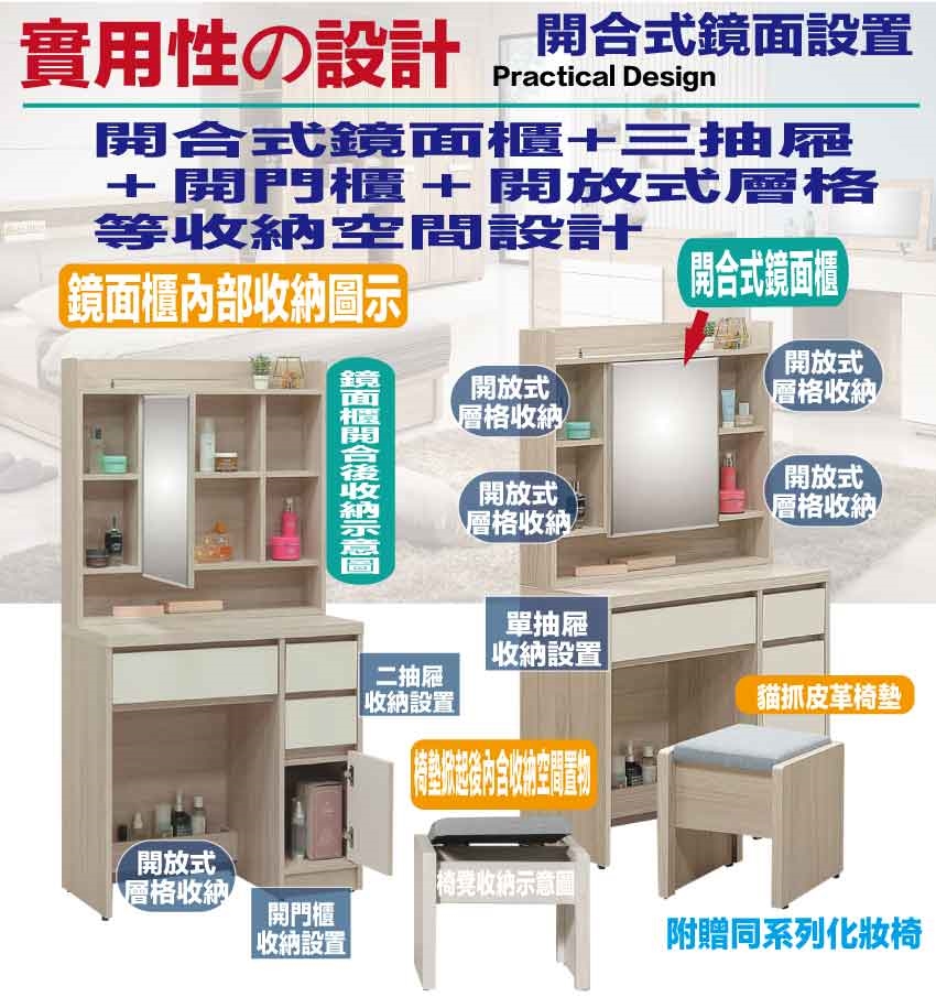 採用開合式鏡面櫃+四抽屜+內&外開放層格等收納空間設計