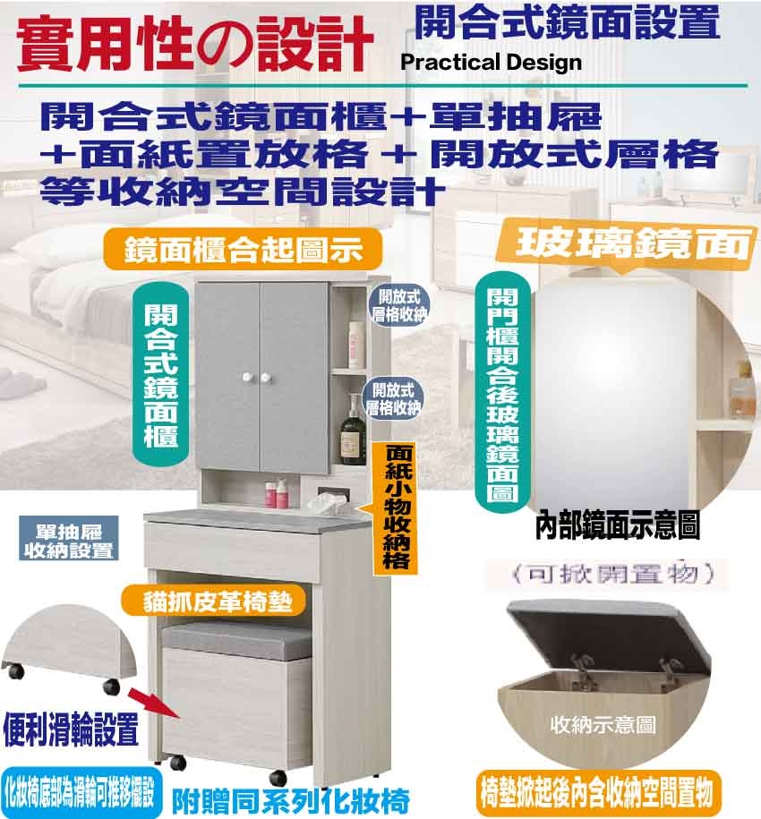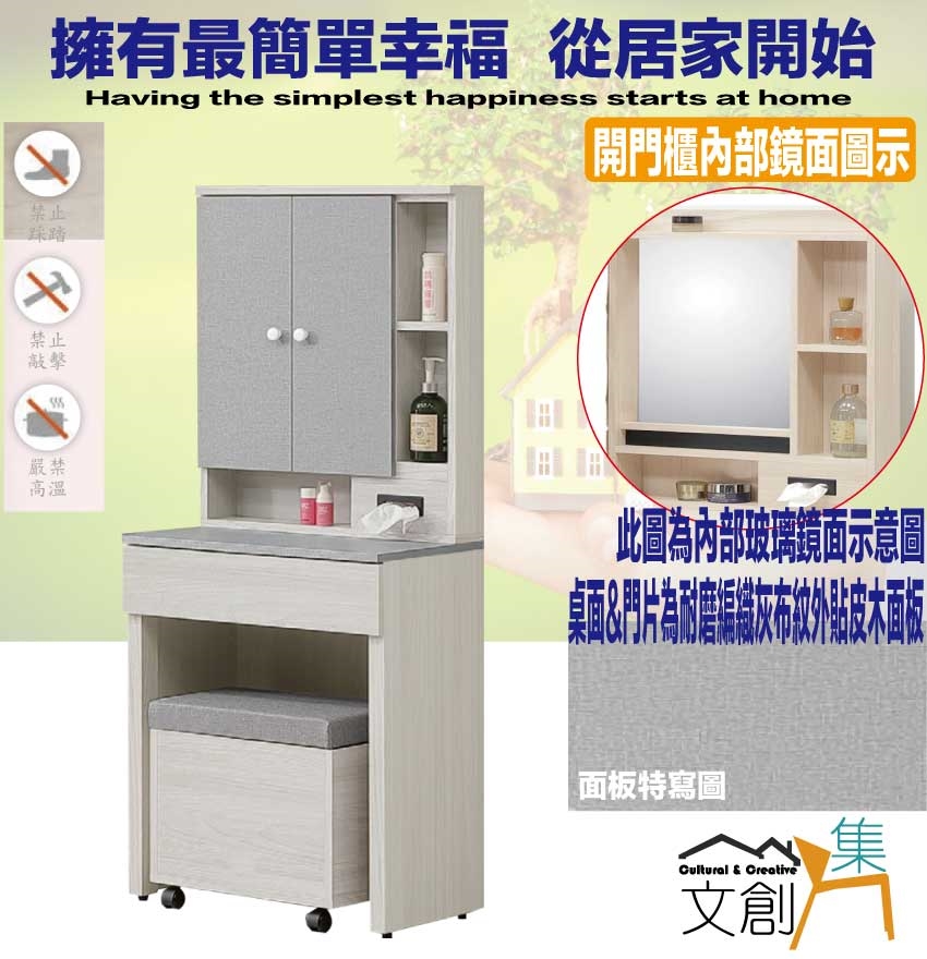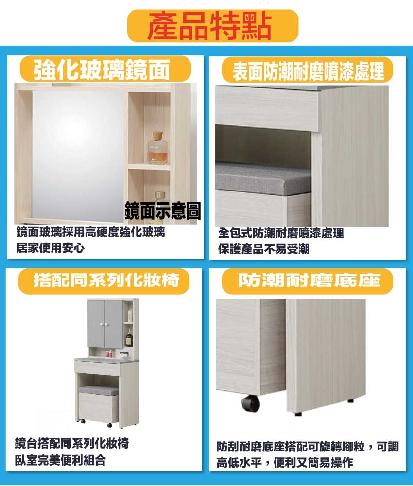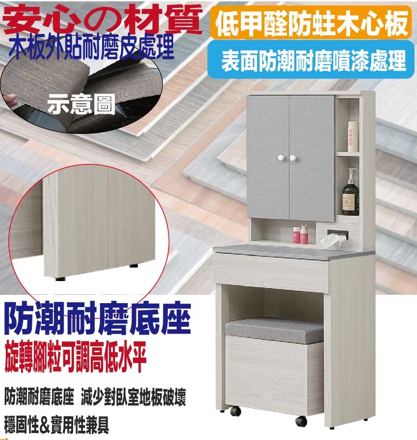 材質:防蛀木心板+強化玻璃鏡面+防潮耐磨底座+化妝椅底部為便利滑輪+桌面&門片為耐磨編織木紋貼皮