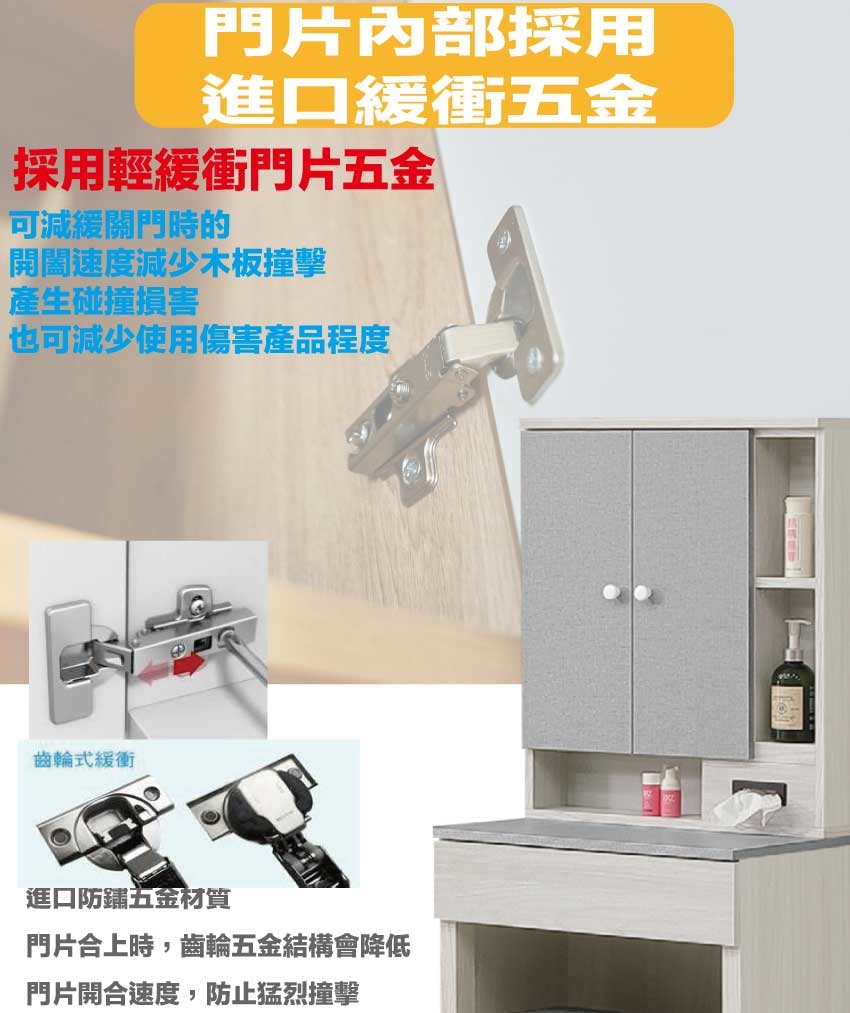 採用防蛀木心板+強化玻璃鏡面+防潮耐磨底座+防夾手緩衝門片五金+桌面&門片為耐磨編織木紋貼皮等安心材質製造