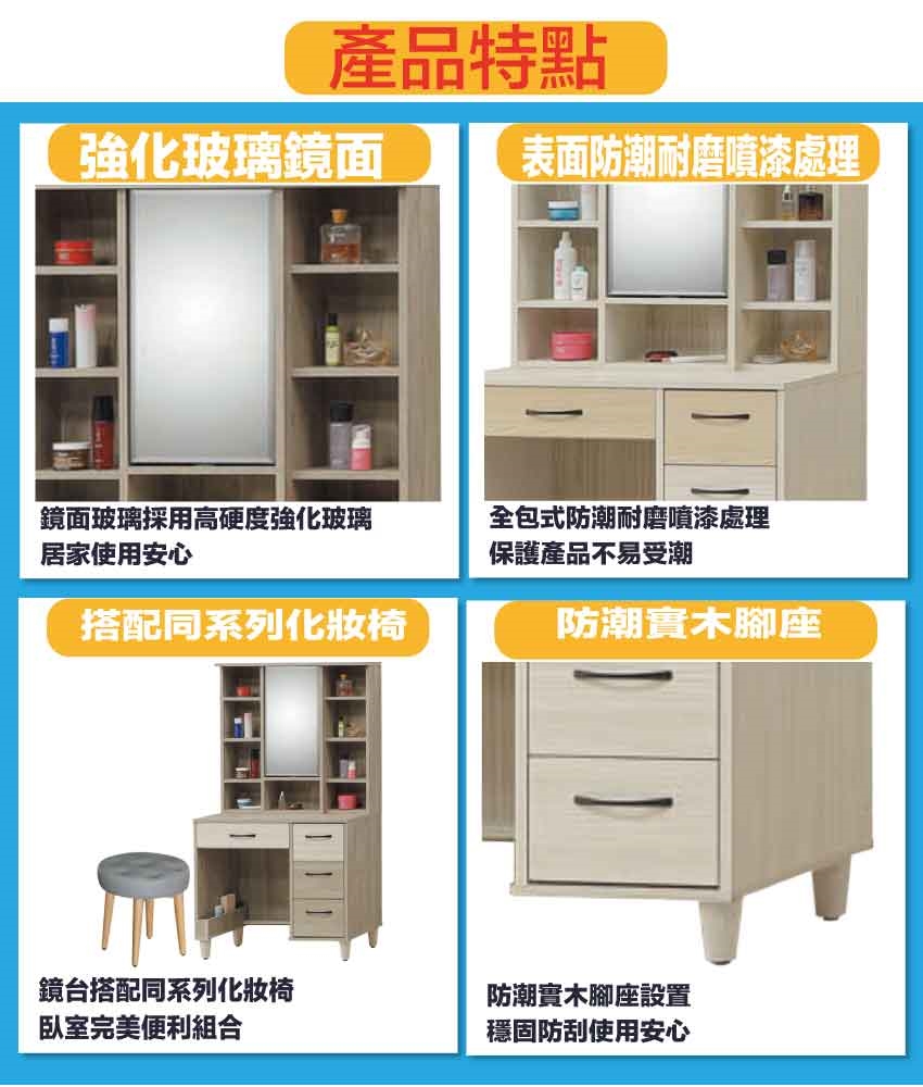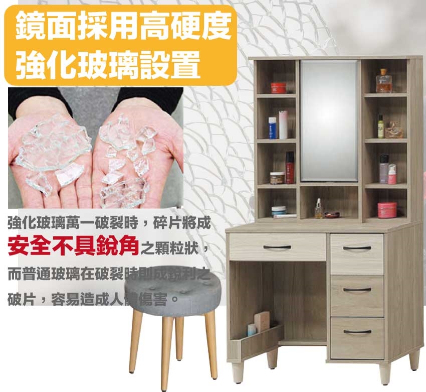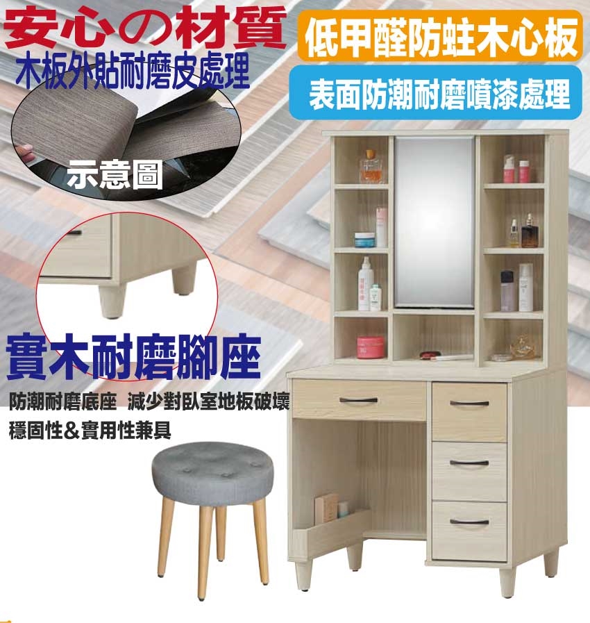 採用防蛀木心板+防潮實木腳座+強化玻璃鏡面等安心材質製造
