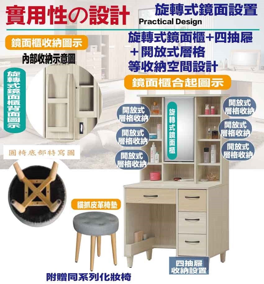 搭配採用旋轉鏡面櫃+四抽屜+內&外開放層格等收納空間設計