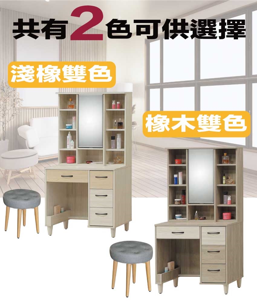 ★下訂前注意 由於商品流動較快,下訂前請先詢問是否有貨在下訂喔~★ 【綠家居】米賽倫2.7尺旋轉鏡面鏡台組合(二色可選+含化妝椅) 二色可選+安心材質製造,使用放心+搭配居家更便利,採用防蛀木心板+防潮實木腳座+強化玻璃鏡面等安心材質製造 ,外層採用防潮耐磨噴漆處理搭配採用旋轉鏡面櫃+四抽屜+內&外開放層格等收納空間設計,全由專人配送到家,專業安心服務,替你省下更多時間!
