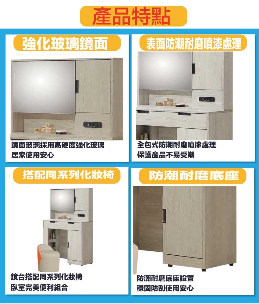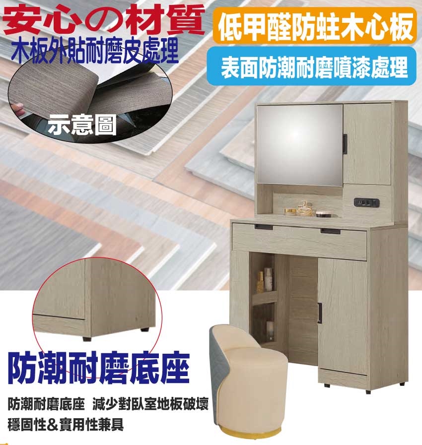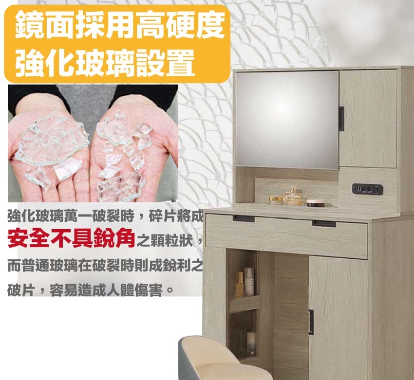 採用防蛀木心板+防潮耐磨底座+強化玻璃鏡面等安心材質製造