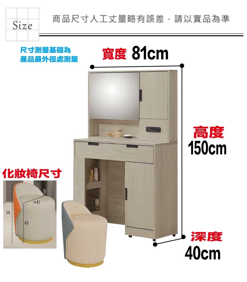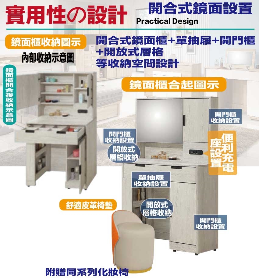 產品名稱:【綠家居】賽斯2.7尺開門鏡面鏡台組合(二色可選+含皮革化妝椅) - 尺寸:(寬)81x(深)40x(高)150/公分