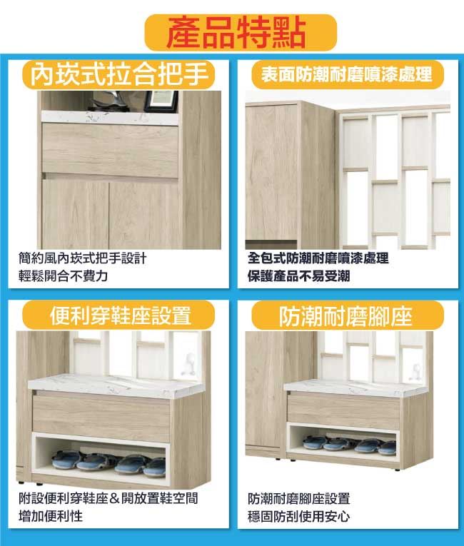商品 介紹 | 【綠家居】羅娜4尺四門二抽高玄關屏風坐鞋櫃組合 木紋雙色系+現代簡約風格+安心材質製造,整體採用防蛀木心板+防潮耐磨腳座+五金滑軌結構+防夾手緩衝門片五金等安心材質製造,產品外層採用防潮耐磨噴漆處理搭配採用開門櫃+二抽屜(單抽格)+穿鞋椅凳設置+內&外開放式層格等收納空間設計,全由專人配送到家,專業安心服務,替你省下更多時間! 【商品特色】 木紋雙色系+現代簡約風格+安心材質製造,使用放心+搭配居家更便利 採用防蛀木心板+防潮耐磨腳座+五金滑軌結構+防夾手緩衝門片五金等安心材質製造 產品外層採用防潮耐磨噴漆處理 採用開門櫃+二抽屜(單抽格)+穿鞋椅凳設置+內&外開放式層格等收納空間設計 此商品不需要DIY組立,此商品為組立後之成品 品質保證、專業設計、貼心服務 全由專人配送到家,專業安心服務,替您省下更多時間 |