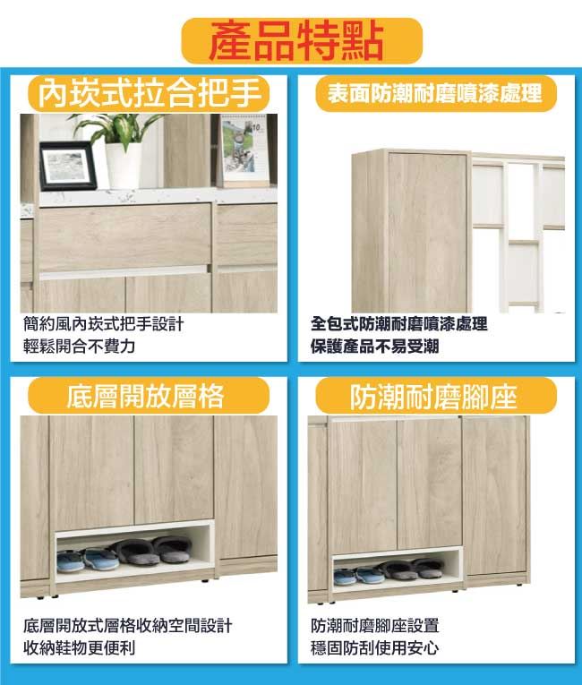 商品 介紹 | 【綠家居】羅娜4.1尺六門三抽高玄關屏風鞋櫃組合 木紋雙色系+現代簡約風格+安心材質製造,整體採用防蛀木心板+防潮耐磨腳座+五金滑軌結構+防夾手緩衝門片五金等安心材質製造,產品外層採用防潮耐磨噴漆處理搭配採用開門櫃+三抽屜+內&外開放式層格等收納空間設計,全由專人配送到家,專業安心服務,替你省下更多時間! 【商品特色】 木紋雙色系+現代簡約風格+安心材質製造,使用放心+搭配居家更便利 採用防蛀木心板+防潮耐磨腳座+五金滑軌結構+防夾手緩衝門片五金等安心材質製造 產品外層採用防潮耐磨噴漆處理 採用開門櫃+三抽屜+內&外開放式層格等收納空間設計 此商品不需要DIY組立,此商品為組立後之成品 品質保證、專業設計、貼心服務 全由專人配送到家,專業安心服務,替您省下更多時間 |