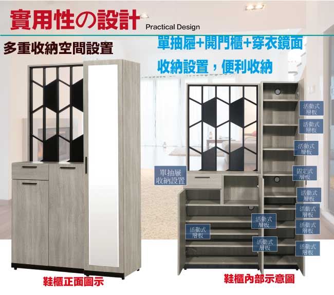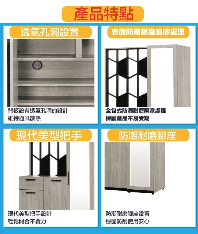 商品 介紹 | 【綠家居】卡瑞4尺二門單抽高玄關屏風鏡面鞋櫃組合 木紋雙色系+現代簡約風格+安心材質製造,整體採用防蛀木心板+防潮耐磨腳座+五金滑軌結構+強化玻璃鏡面+防夾手緩衝門片五金等安心材質製造,產品外層採用防潮耐磨噴漆處理搭配採用鏡面櫃(內含收納層格)+開門櫃+單抽屜+內開放式層格等收納空間設計,全由專人配送到家,專業安心服務,替你省下更多時間! 【商品特色】 木紋雙色系+現代簡約風格+安心材質製造,使用放心+搭配居家更便利 採用防蛀木心板+防潮耐磨腳座+五金滑軌結構+強化玻璃鏡面+防夾手緩衝門片五金等安心材質製造 產品外層採用防潮耐磨噴漆處理 採用鏡面櫃(內含收納層格)+開門櫃+單抽屜+內開放式層格等收納空間設計 此商品不需要DIY組立,此商品為組立後之成品 品質保證、專業設計、貼心服務 全由專人配送到家,專業安心服務,替您省下更多時間 |