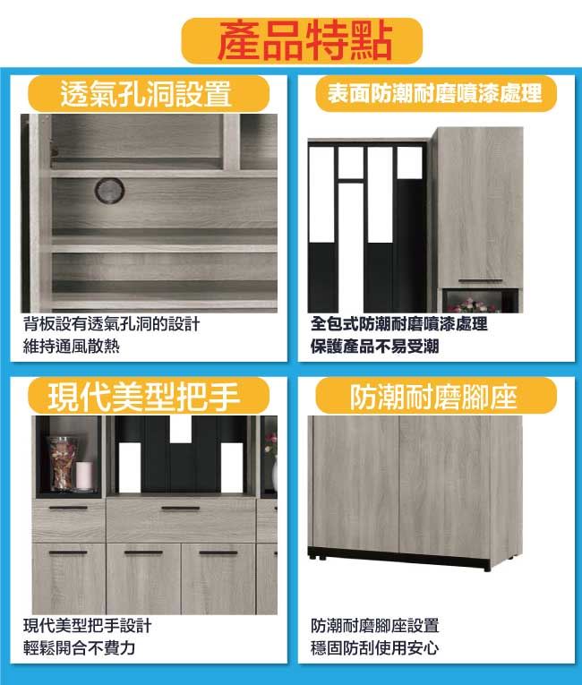 商品 介紹 | 【綠家居】卡瑞4.7尺六門三抽高玄關屏風鞋櫃組合 木紋雙色系+現代簡約風格+安心材質製造,整體採用防蛀木心板+防潮耐磨腳座+五金滑軌結構+防夾手緩衝門片五金等安心材質製造,產品外層採用防潮耐磨噴漆處理搭配採用開門櫃+三抽屜+內&外開放式層格等收納空間設計,全由專人配送到家,專業安心服務,替你省下更多時間! 【商品特色】 木紋雙色系+現代簡約風格+安心材質製造,使用放心+搭配居家更便利 採用防蛀木心板+防潮耐磨腳座+五金滑軌結構+防夾手緩衝門片五金等安心材質製造 產品外層採用防潮耐磨噴漆處理 採用開門櫃+三抽屜+內&外開放式層格等收納空間設計 此商品不需要DIY組立,此商品為組立後之成品 品質保證、專業設計、貼心服務 全由專人配送到家,專業安心服務,替您省下更多時間 |