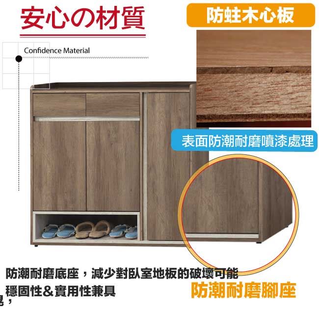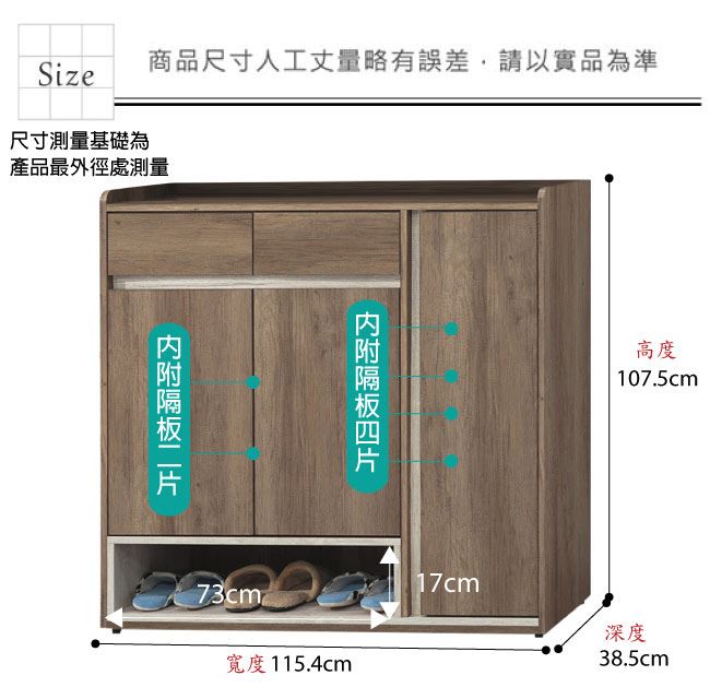 材質 | ◆產品名稱:【綠家居】克倫3.8尺三門二抽低玄關鞋櫃(二色可選) 尺寸:(寬)115.4x(深)38.5(高)107.5/公分 ◆材質: 材質:防蛀木心板+防潮耐磨腳座+防夾手緩衝門片五金+五金滑軌結構 噴漆:防潮耐磨噴漆處理