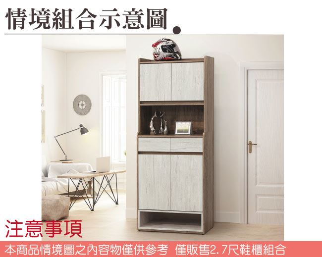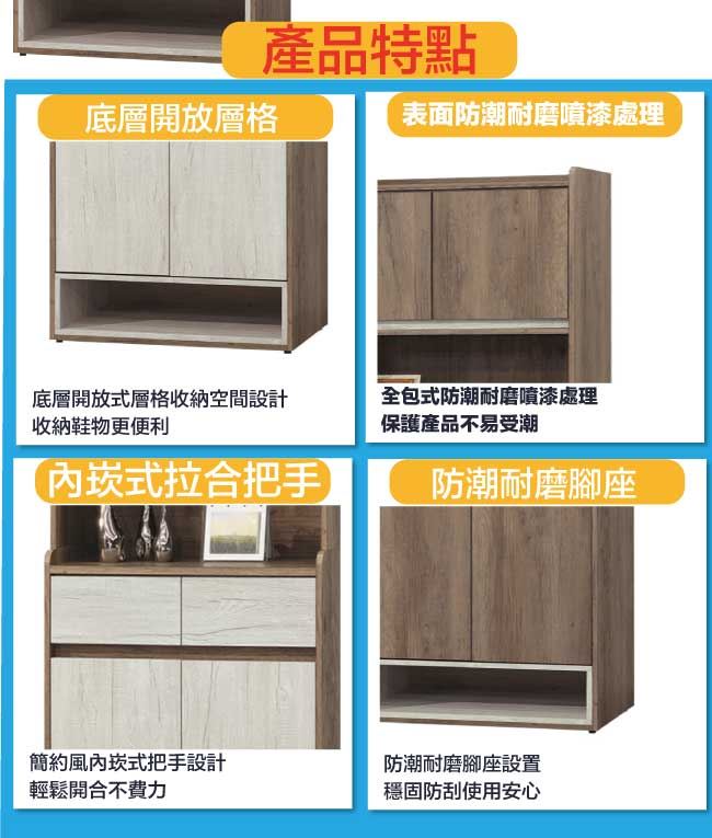 商品 介紹 | 【綠家居】克倫2.7尺四門二抽高玄關鞋櫃組合(二色可選) 二色可選+現代簡約風格+安心材質製造,使用放心+搭配居家更便利,整體採用防蛀木心板+防潮耐磨腳座+防夾手緩衝門片五金+五金滑軌結構等材質搭配外層採用優莉坦耐磨全包式噴漆處理 ,採用開門櫃+二抽屜+內&外開放層格等收納空間設計,全由專人配送到家,專業安心服務,替你省下更多時間! 【商品特色】 二色可選+現代簡約風格+安心材質製造,使用放心+搭配居家更便利 防蛀木心板++防夾手緩衝門片五金+五金滑軌結構等材質 採用開門櫃+二抽屜+內&外開放層格等收納空間設計 此商品不需要DIY組立,此商品為組立後之成品 品質保證、專業設計、貼心服務 全由專人配送到家,專業安心服務,替您省下更多時間 |