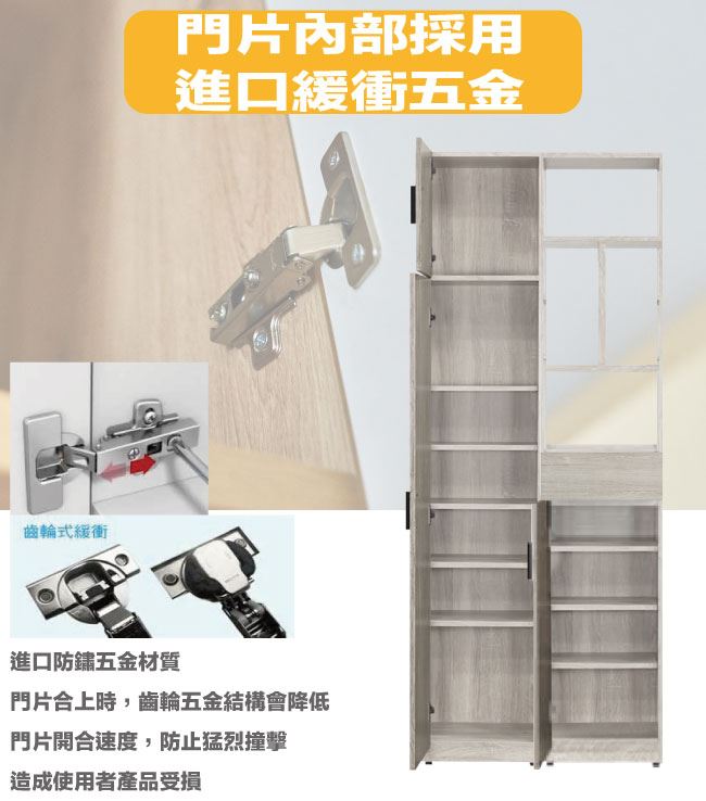 材質 | ◆產品名稱:【綠家居】葛妮格雙色2.7尺三門單抽高玄關鞋櫃組合 尺寸:(寬)80x(深)40x(高)198/公分 ◆材質: 材質:防蛀木心板+防潮耐磨底座+防夾手緩衝門片五金 表面防潮耐磨噴漆處理 |