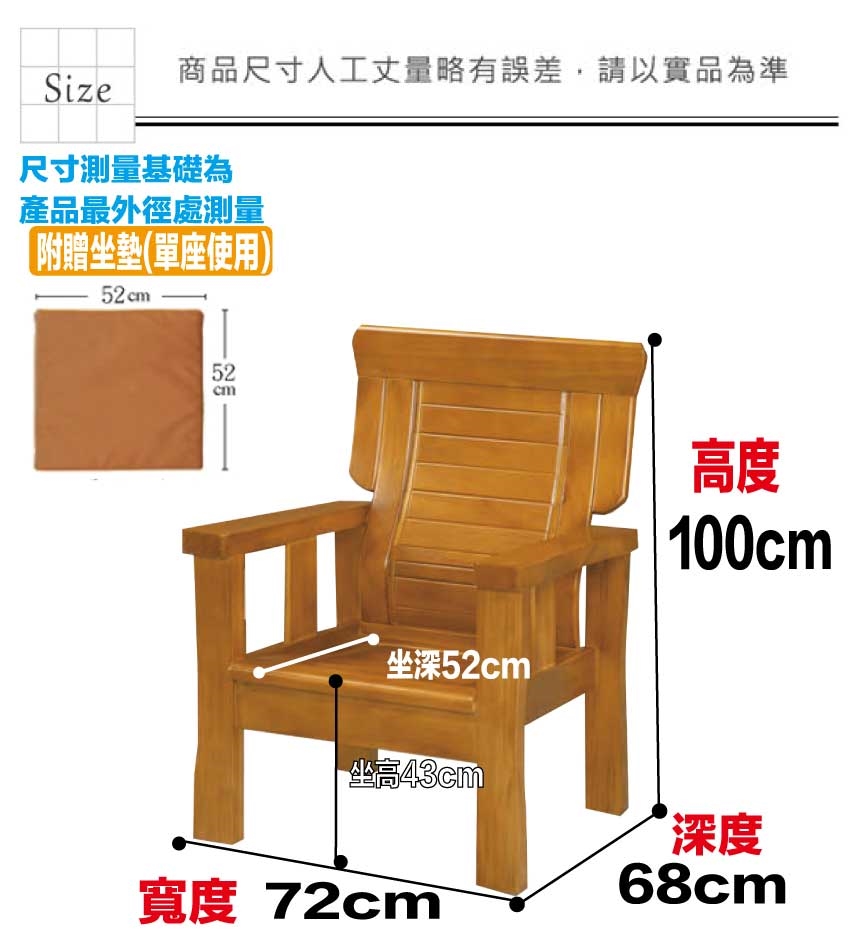 產品名稱:【綠家居】布許檜木色單人座實木椅 - 尺寸:(寬)72x(深)68x(高)100/公分