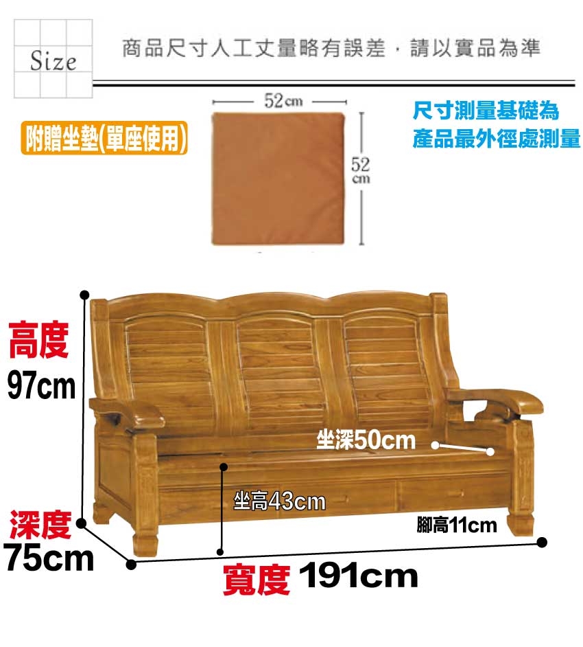 產品名稱:【綠家居】海灣樟木色三人座柚木實木椅(底部抽屜可收納) - 尺寸:(寬)191x(深)75x(高)97/公分